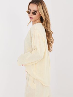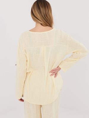 Μπλούζα καθημερινής χρήσης φτιαγμένη από υψηλής ποιότητας βαμβάκι, που προσφέρει άνεση και διαπνοή καθ’ όλη τη διάρκεια της ημέρας. Το μοντέλο με το απλό σχέδιο το καθιστά ευέλικτο και εύκολο να προσαρμοστεί σε πολλές στυλιστικές επιλογές, τόσο με τζιν όσο και με φούστες. Η μπλούζα διαθέτει V-ντεκολτέ στολισμένο με έναν διακριτικό κόμπο, που της προσθέτει μια απαλή, γυναικεία αίσθηση. Η κανονική της μήκος την κάνει να εφαρμόζει καλά στη σιλουέτα και επιτρέπει να φοριέται με πολλούς τρόπους. Το μοντέλο διαθέτει μακριά μανίκια με δυνατότητα αναδίπλωσης, έτσι ώστε η μπλούζα να μπορεί να προσαρμοστεί εύκολα στον καιρό και τη στυλιστική επιλογή. Η απουσία κλεισίματος την καθιστά άνετη και γρήγορη στην τοποθέτηση, ιδανική για καθημερινές περιστάσεις.