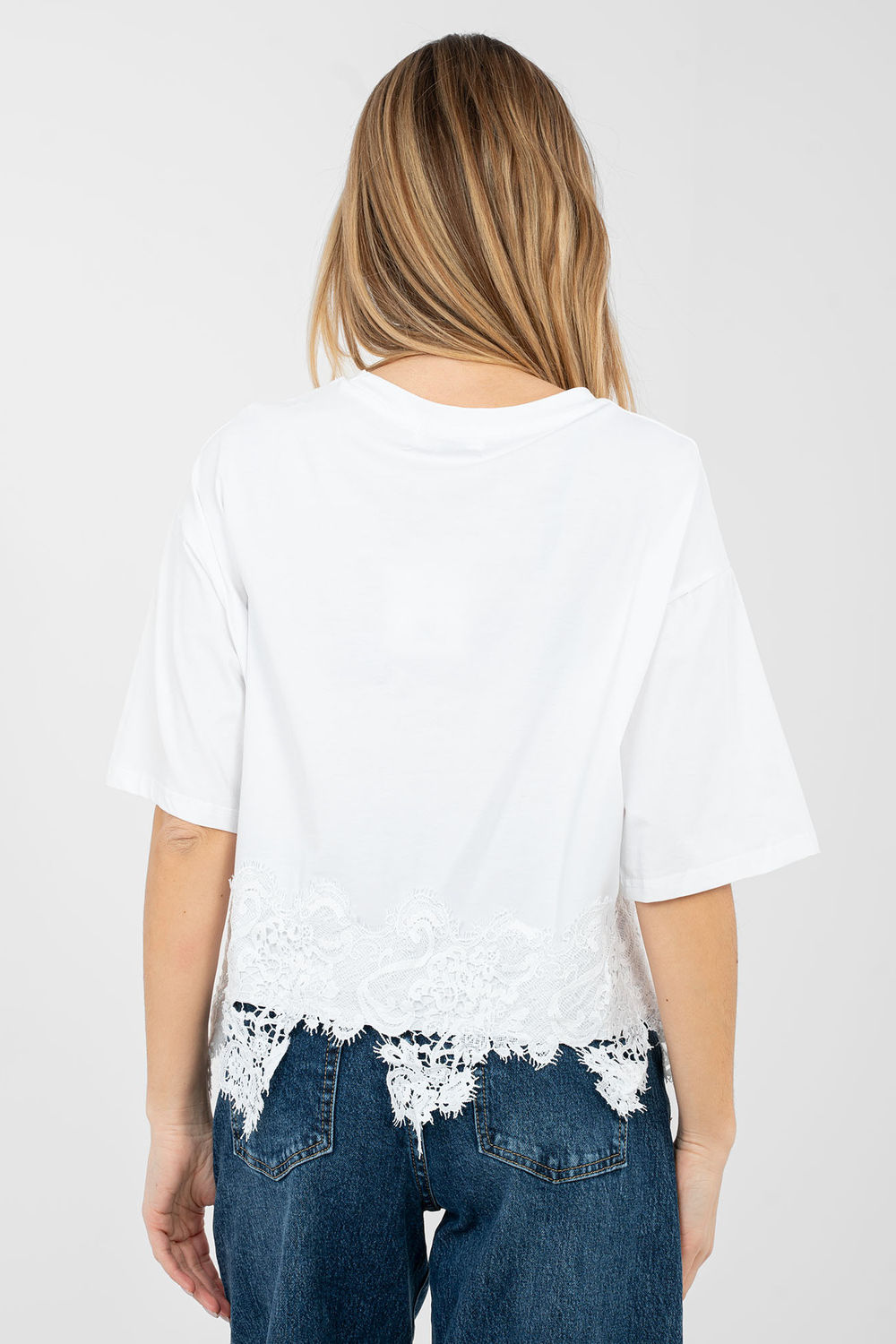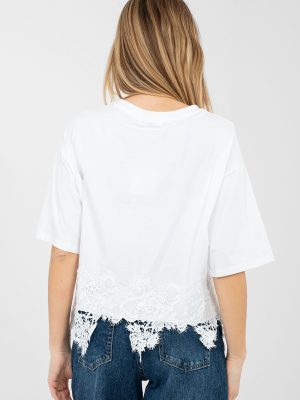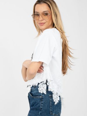 Γυναικεία μπλούζα καθημερινής χρήσης με μοντέρνο και θηλυκό χαρακτήρα. Κατασκευασμένη από υψηλής ποιότητας βαμβάκι με προσθήκη ελαστάνης, προσφέρει άνεση στην αίσθηση, ελαστικότητα και καλή εφαρμογή στη σιλουέτα. Το μοντέλο με κοντό μήκος και κοντό μανίκι είναι ιδανικό για ζεστές μέρες. Ο στρογγυλός λαιμός προσδίδει στην μπλούζα κλασική και διαχρονική εμφάνιση. Η εκτύπωση στο μπροστινό μέρος, διακοσμημένη με διακριτικές ζαφείρια, τραβά την προσοχή και προσθέτει μια διακριτική λάμψη στην εμφάνιση. Ένα επιπλέον πλεονέκτημα είναι η διακοσμητική δαντέλα στο κάτω μέρος της μπλούζας, που τονίζει το γυναικείο στυλ. Ιδανική πρόταση για καθημερινές συνδυασμούς με τζιν, φούστες ή σορτς.