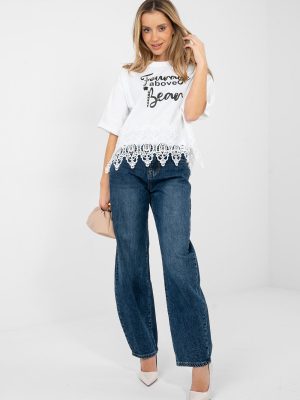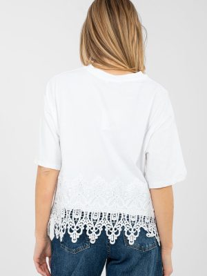 Καθημερινό γυναικείο μπλουζάκι με θηλυκή και κομψή εμφάνιση. Κατασκευασμένο από βαμβάκι υψηλής ποιότητας με πρόσμιξη elastane, εξασφαλίζει άνεση κατά τη φορά, ελαστικότητα και καλό ταίριασμα με τη σιλουέτα. Το μοντέλο με κοντό μήκος και κοντά μανίκια είναι ιδανικό για πιο ζεστές ημέρες. Ο στρογγυλός λαιμός τονίζει την κλασική γραμμή και προσδίδει στο μπλουζάκι μια ευέλικτη εμφάνιση. Οι διακοσμητικές επιγραφές μπροστά, συμπληρωμένες με ζιργκόν, τραβούν την προσοχή και προσθέτουν μια μοντέρνα νότα στη συνολική εικόνα. Επιπλέον πλεονέκτημα είναι η δαντέλα στο κάτω μέρος του μπλουζιού καθώς και οι υποτονικές ζιργκόν που προσθέτουν λάμψη θηλυκότητας. Ιδανικό για καθημερινές εμφανίσεις με τζιν, σορτς ή φούστα.
