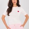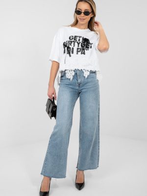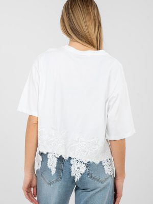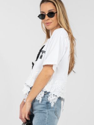 Καθημερινό γυναικείο μπλουζάκι με γυναικεία και κομψή χαρακτήρα. Κατασκευασμένο από υφάσματα υψηλής ποιότητας βαμβακιού με προσθήκη ελαστάνης, προσφέρει άνεση κατά τη διάρκεια της χρήσης, ευελιξία και καλή εφαρμογή στο σχήμα του σώματος. Το μοντέλο με κοντό μήκος και κοντά μανίκια είναι ιδανικό για τις πιο ζεστές μέρες. Ο στρογγυλός λαιμός αναδεικνύει την κλασική γραμμή και προσδίδει στο μπλουζάκι έναν универсальный вид. Οι διακοσμητικές γραφές μπροστά, σε συνδυασμό με λεπτό δαντέλα, τραβούν την προσοχή και δίνουν έμφαση στην ταυτότητα του μπλουζιού. Ένα επιπλέον πλεονέκτημα είναι η δαντέλα στο κάτω μέρος του μπλουζιού καθώς και οι διακριτικές ζιρκόνιες, οι οποίες προσθέτουν γυναικεία λάμψη. Ιδανικό για καθημερινές στυλιστικές προτάσεις με τζιν, σορτς ή φούστες.