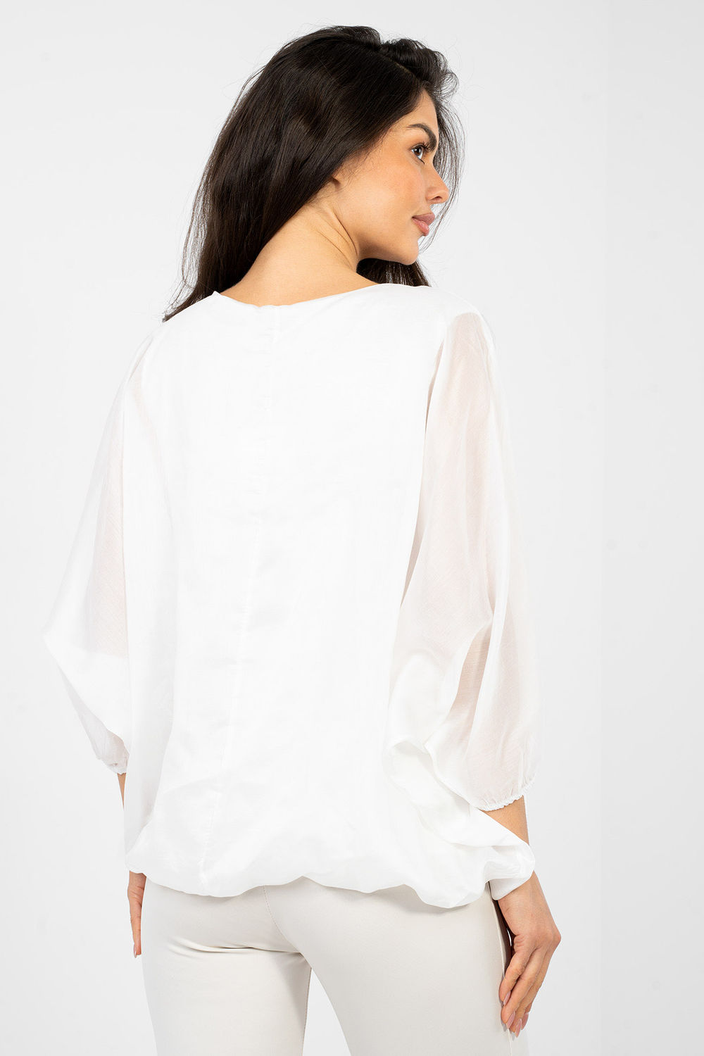 Κομψό μπλουζάκι σε κανονικό μήκος, ιδανικό για εργασία και επίσημες περιστάσεις, συνδυάζοντας στυλ και άνεση στη φθορά. Το μοντέλο κατασκευάζεται από έναν συνδυασμό τενκέλ και πολυεστέρα, εξασφαλίζοντας ευχάριστη απαλότητα και αντοχή του υφάσματος. Το μπλουζάκι διαθέτει κλασικό, στρογγυλό ντεκολτέ και μανίκια 3/4, ενώ το ομαλό σχέδιο του προσδίδει έναν καθολικό χαρακτήρα. Ένα επιπλέον πλεονέκτημα είναι η φόδρα στη κεντρική περιοχή, η οποία υπογραμμίζει διακριτικά τη σιλουέτα και εξασφαλίζει κομψή τοποθέτηση κάτω από τα ρούχα. Ιδανικό τόσο για γραφειακές συνθέσεις όσο και για πιο επίσημες εξόδους.