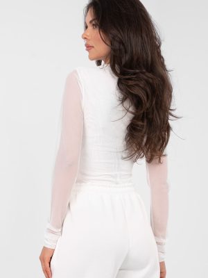 Μια κομψή, εφαρμοστή γυναικεία μπλούζα είναι μια μοναδική πρόταση για τις γυναίκες που εκτιμούν το στυλ και την ευελιξία. Είναι ιδανική για επισκέψεις, για τη δουλειά, για πάρτι, καθώς και για καθημερινές, πιο ντυμένες εμφανίσεις. Η λεία υφή τονίζει τον διαχρονικό της χαρακτήρα και επιτρέπει εύκολους συνδυασμούς με άλλα κομμάτια της γκαρνταρόμπας. Η μπλούζα έχει κατασκευαστεί από υψηλής ποιότητας πολυεστέρα με προσθήκη ελαστάνης, που εξασφαλίζει ευελιξία, άνεση κατά τη χρήση και καλή εφαρμογή στο σώμα. Το κοντό μήκος υπογραμμίζει με λεπτότητα τις αναλογίες, ενώ η ρομαντική, στρογγυλή λαιμόκοψη προσθέτει μια νότα απλότητας και γυναικείας κομψότητας. Το μοντέλο διαθέτει μακριά μανίκια από δικτυωτό υλικό χωρίς φόδρα, που προσδίδουν ελαφρότητα και εντυπωσιακή εμφάνιση. Στο κέντρο, η μπλούζα είναι εξοπλισμένη με φόδρα, που εξασφαλίζει άνεση και κατάλληλη κάλυψη. Ένα επιπλέον πλεονέκτημα είναι η πτυχή, που όμορφα διαμορφώνει τη σιλουέτα και τονίζει τον κομψό χαρακτήρα της μπλούζας. Η έλλειψη κλεισίματος καθιστά το μοντέλο άνετο και εύκολο στη χρήση. Είναι μια στυλάτη και γυναικεία μπλούζα, ιδανική για παντελόνια σε ψηλή μέση, φούστες καθώς και για κομψά σακάκια.