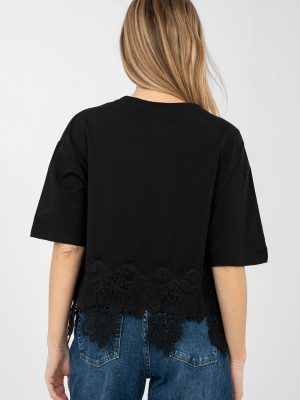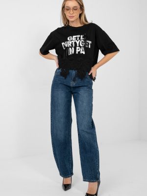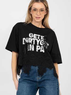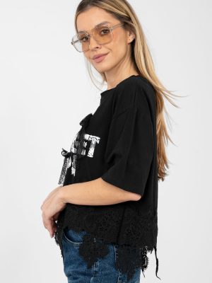 Κάθετη γυναικεία μπλούζα με θηλυκό και στυλάτο χαρακτήρα. Φτιαγμένη από υψηλής ποιότητας βαμβάκι με προσθήκη ελαστάνης, παρέχει άνεση στη χρήση, ελαστικότητα και καλό προσαρμογή στη σιλουέτα. Το μοντέλο με κοντό μήκος και κοντά μανίκια είναι εξαιρετικό για τις θερμότερες ημέρες. Ο στρογγυλός λαιμός αναδεικνύει το κλασικό σχέδιο και προσδίδει στη μπλούζα μια καθολική εμφάνιση. Οι διακοσμητικές επιγραφές στο μπροστινό μέρος, συμπληρωμένες με λεπτό δαντέλα, τραβούν την προσοχή και δίνουν στο σύνολο μια μοντέρνα πινελιά. Επιπλέον πλεονέκτημα είναι η δαντέλα στο κάτω μέρος της μπλούζας καθώς και οι απαλές ζιρκόν, που προσθέτουν θηλυκή λάμψη. Ιδανική για καθημερινές εμφανίσεις με τζιν, σορτς ή φούστα.