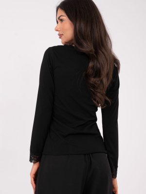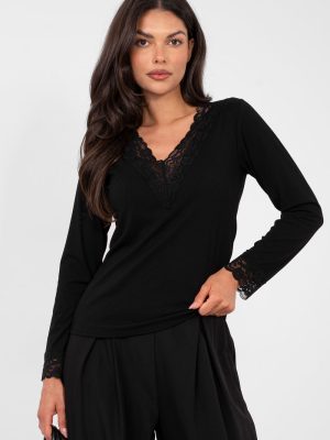 Η κομψή καθημερινή μπλούζα είναι η ιδανική πρόταση για γυναίκες που εκτιμούν την άνεση συνδυασμένη με διακριτική κομψότητα. Το μοντέλο που διατηρεί τον casual στυλ είναι ιδανικό τόσο για καθημερινή χρήση όσο και για το γραφείο, δημιουργώντας αισθησιακές και θηλυκές εμφανίσεις. Η λεία επιφάνεια και η ραβδωτή υφή του υλικού προσδίδουν στη μπλούζα μια σύγχρονη και ταυτόχρονα универсαλ χαρακτήρα. Η μπλούζα έχει παραχθεί από ελαστικό και ευχάριστο στο φόρεμα μείγμα πολυεστέρα και ελαστάνης, γεγονός που εξασφαλίζει άνεση και καλή εφαρμογή στο σχήμα του σώματος. Το стандартικό μήκος καθιστά το μοντέλο ιδανικό σε σύνολα με παντελόνια και φούστες διαφόρων στυλ. Ένα στυλιστικό στοιχείο είναι τα μακριά μανίκια που καταλήγουν σε λεπτό δαντέλα και η V-λαιμόκοψη που είναι επενδυμένη με δαντέλα, τα οποία προσθέτουν στην συνολική γυναίκεια γοητεία και ελαφρότητα. Η απουσία κουμπώματος τονίζει την απλότητα του σχεδίου και τη άνεση κατά την χρήση. Είναι μια μπλούζα που συνδυάζει την καθημερινή άνεση με κομψές λεπτομέρειες, ιδανική για πολλές εμφανίσεις.