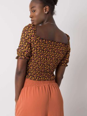 Κοντή μπλούζα σε εφαρμοστό κόψιμο, με κοντά μανίκια. Μπλούζα με λαιμόκοψη V, πιέτες και δέσιμο στο μπροστινό μέρος.