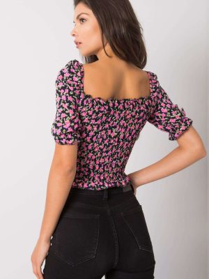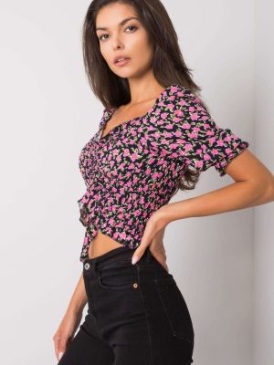 Κοντή μπλούζα σε εφαρμοστό κόψιμο, με κοντά μανίκια. Μπλούζα με λαιμόκοψη V, πιέτες και δέσιμο στο μπροστινό μέρος.