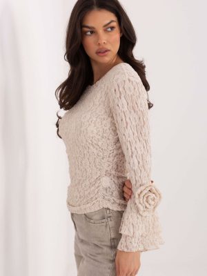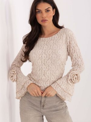 Η κομψή, δαντελωτή μπλούζα είναι μια στυλάτη πρόταση που θα ταιριάξει τέλεια τόσο σε ιδιαίτερες περιστάσεις όσο και σε καθημερινές στυλιστικές επιλογές. Φτιαγμένη από υλικό υψηλής ποιότητας που είναι συνδυασμός πολυεστέρα και ελαστάνης, προσφέρει άνεση κατά την εφαρμογή και καλή εφαρμογή στη σιλουέτα. Η ποικιλόμορφη υφή του υλικού δίνει στην μπλούζα έναν ιδιαίτερο χαρακτήρα και μια διακριτική κομψότητα. Το μοντέλο με κοντό μήκος και στρογγυλή λαιμόκοψη χωρίς κούμπωμα αποπνέει μια ελαφριά και σύγχρονη αίσθηση. Τα μακριά μανίκια τύπου καμπάνα έχουν ολοκληρωθεί με εντυπωσιακές φούσκες και ένα διακοσμητικό λουλούδι από ύφασμα που τραβάει την προσοχή και προσθέτει μια ρομαντική πινελιά στη συνολική εικόνα. Το μπροστινό μέρος της μπλούζας έχει επένδυση, ενώ τα μανίκια και η πλάτη παραμένουν ελαφρώς διαφανή, υπογραμμίζοντας τον δαντελωτό χαρακτήρα του μοντέλου. Πρόσθετες πτυχώσεις στα πλάγια της μπλούζας υπογραμμίζουν διακριτικά τη σιλουέτα. Η μπλούζα είναι τέλεια ως στοιχείο στυλιστικών συνδυασμών για επαγγελματικές συναντήσεις, πάρτι, στη δουλειά, καθώς και στην καθημερινότητα, σε συνδυασμό με παντελόνια ψηλής μέσης, φούστες ή κομψά τζιν.