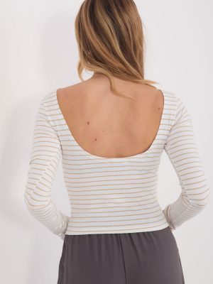 Η προσαρμοσμένη γυναικεία μπλούζα τύπου longsleeve είναι μια κομψή πρόταση σε casual στυλ, ιδανική για καθημερινή χρήση. Η κοντή γραμμή αναδεικνύει όμορφα τη σιλουέτα, ενώ το ελαστικό υλικό προσαρμόζεται στο σώμα, προσφέροντας άνεση και ελευθερία κινήσεων. Το μοντέλο είναι κατασκευασμένο από συνδυασμό βαμβακιού και ελαστάνης, είναι ευχάριστο στην αφή, αναπνεύσιμο και ελαφρώς ελαστικό. Το σχέδιο με ρίγες προσδίδει στη συνολική εμφάνιση μια διαχρονική αίσθηση και κάνει τη μπλούζα να κολλάει άψογα στις καθημερινές στυλιστικές επιλογές. Ο λαιμός τύπου bateau εκθέτει κομψά τη γραμμή των ώμων, ενώ ο πιο βαθύς λαιμός στην πλάτη προσθέτει μια αισθησιακή πινελιά και ξεχωρίζει το μοντέλο σε σύγκριση με τις κλασικές γραμμές. Το μακρύ μανίκι και η απουσία κλεισίματος υπογραμμίζουν τον μινιμαλιστικό, σύγχρονο σχεδιασμό. Είναι η τέλεια επιλογή για τζιν, σορτς ή φούστες με ψηλή μέση, μια ιδανική βάση για μοντέρνες, χαλαρές στυλιστικές προτάσεις.