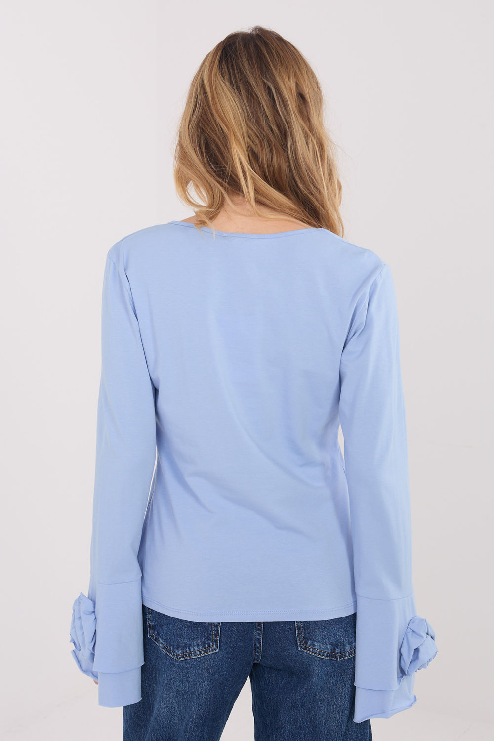 Εντυπωσιακή μπλούζα τύπου longsleeve με εφαρμοστή γραμμή, που τονίζει αποτελεσματικά τη σιλουέτα και συνδυάζει την κλασική κομψότητα με διακοσμητικές λεπτομέρειες. Κατασκευασμένη από βαμβάκι υψηλής ποιότητας, εξασφαλίζει άνεση και ευχάριστη εφαρμογή καθ’ όλη τη διάρκεια της ημέρας. Το μοντέλο με ομαλή υφή διαθέτει ντεκολτέ σε σχήμα V, που εκθέτει διακριτικά τον λαιμό και προσθέτει μια θηλυκή αίσθηση. Οι μακριές μανίκες τύπου καμπάνα προσδίδουν ελαφρότητα και κομψότητα στο σύνολο, ενώ τα διακοσμητικά, υφασμάτινα λουλούδια που είναι τοποθετημένα στους μανίκες και γύρω από το ντεκολτέ αποτελούν μια μοναδική διακοσμητική πινελιά. Η κανονική του μήκος εξασφαλίζει ότι η μπλούζα είναι ιδανική τόσο για καθημερινές εμφανίσεις, για στη δουλειά, σε επαγγελματικές συναντήσεις, όσο και για επίσημες εξόδους ή εκδηλώσεις.