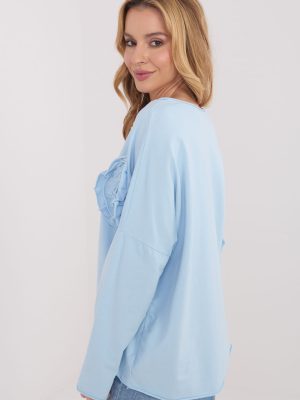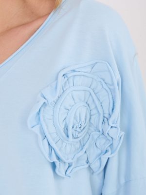 Κασual μπλούζα καθημερινής χρήσης, που συνδυάζει άνεση με διακριτική, γυναικεία λεπτομέρεια. Κατασκευασμένη από μαλακό βαμβάκι με προσθήκη ελαστάνης, προσφέρει άνετη εφαρμογή και ελαφρώς στενή γραμμή. Το μοντέλο έχει κανονικό μήκος, διαθέτει μακριά μανίκια και V λαιμόκοψη, που εκθέτει διακριτικά τον λαιμό. Κυρίαρχο διακοσμητικό στοιχείο είναι η εφαρμογή σε σχήμα λουλουδιού, που προσδίδει στην μπλούζα μια διακριτική, στυλάτη αίσθηση. Ιδανική πρόταση για καθημερινές, casual συνθέσεις που συνδυάζουν άνεση με γυναικεία χάρη.
