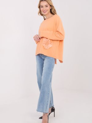 Casual μπλούζα με καθημερινό χαρακτήρα, που συνδυάζει άνεση με διακριτική, γυναικεία πινελιά. Κατασκευασμένη από μαλακό μείγμα βαμβακιού και πολυεστέρα, προσφέρει άνεση στη χρήση και αντοχή του υφάσματος. Το μοντέλο με ομαλό φόντο διαθέτει κλασικό, στρογγυλό λαιμόκοψη και μακριά μανίκια, καθιστώντας το ένα πανανθρώπινο στοιχείο της καθημερινής γκαρνταρόμπας. Μια διακριτική διακόσμηση είναι η εφαρμογή με ραμμένο λουλούδι στην αριστερή πλευρά στο κάτω μέρος, που δίνει στη μπλούζα μια διακριτική γοητεία και χαρακτήρα. Η απουσία κλεισίματος υπογραμμίζει την απλότητα και τον ελεύθερο στυλ αυτού του μοντέλου.