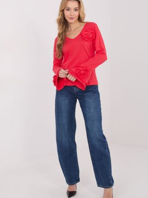 Μια κομψή μπλούζα με μακρύ μανίκι και εφαρμοστό κόψιμο, που αναδεικνύει εντυπωσιακά τη σιλουέτα και συνδυάζει την κλασική γραμμή με διακοσμητικά στοιχεία. Κατασκευασμένη από υλικό υψηλής ποιότητας, προσφέρει άνεση κατά την εφαρμογή και ευχάριστη αίσθηση καθόλη τη διάρκεια της ημέρας. Το μοντέλο με την ομαλή υφή διαθέτει V λαιμόκοψη, που υπογραμμίζει διακριτικά τον λαιμό και προσδίδει γυναικεία μεταξένια χαρακτηριστικά. Τα μακριά μανίκια τύπου καμπάνα προσθέτουν ελαφρότητα και κομψότητα στο σύνολο, ενώ τα διακοσμητικά, υφασμάτινα λουλούδια τοποθετημένα στα μανίκια και στον λαιμό αποτελούν μια μοναδική διακοσμητική πινελιά. Η τυπική μήκος καθιστά την μπλούζα ιδανική τόσο για καθημερινές εμφανίσεις, για τη δουλειά, για επίσημες συναντήσεις, όσο και για κομψές εξόδους ή εκδηλώσεις.