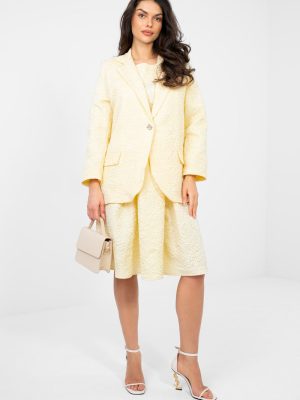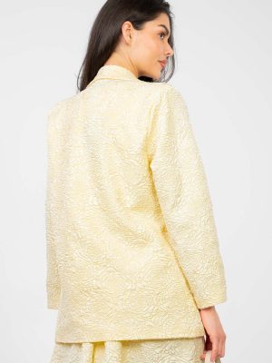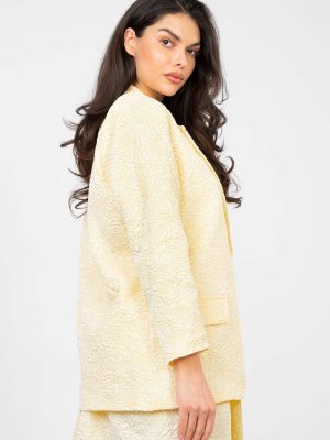 Μια κομψή γυναικεία σακάκι σε κανονικό μήκος, που συνδυάζει τέλεια την κλασική αισθητική με μια υποtle νότα πρωτοτυπίας. Το μοντέλο ξεχωρίζει για την ποικιλία της υφής του υλικού και την εντυπωσιακή ανάγλυφη εκτύπωση λουλουδιών, προσφέροντας στο σύνολο μια μοναδική, γυναικεία σφραγίδα. Κατασκευασμένο από υλικά υψηλής ποιότητας, μείγμα πολυεστέρα και βισκόζης, εξασφαλίζει άνεση κατά τη χρήση, αντοχή και αισθητική εμφάνιση για μεγάλο χρονικό διάστημα. Το μακρύ μανίκι και οι καπιτονέ πατιλέτες τονίζουν τη διαχρονική σιλουέτα, ενώ το μονόκουμπο κούμπωμα προσθέτει κομψότητα και ευελιξία. Το σακάκι διαθέτει επένδυση, έτσι ώστε να εφαρμόζει τέλεια στη σιλουέτα και να εγγυάται άνεση κατά την χρήση. Είναι η ιδανική επιλογή τόσο για επαγγελματικές εμφανίσεις όσο και για ιδιαίτερες περιστάσεις, όταν θέλετε να φαίνεστε στιλάτη και με τάξη.