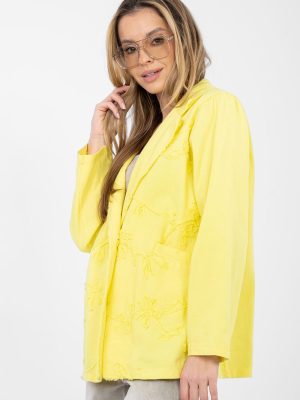 Μια casual γυναικεία σακάκι κατασκευασμένο από υψηλής ποιότητας βαμβάκι, ιδανικό για καθημερινές στυλιστικές επιλογές. Το τζιν ύφασμα του προσδίδει έναν ελεύθερο χαρακτήρα, ενώ ταυτόχρονα καθιστά το μοντέλο διαχρονικό και универсал. Το σακάκι έχει κανονικό μήκος, με μακριά μανίκια και κλασικά, επεξεργασμένα πέτα. Μια εξαιρετική λεπτομέρεια είναι τα υφασμένα λουλούδια που βρίσκονται στο μπροστινό μέρος, τα οποία προσθέτουν μια γυναικεία και πρωτότυπη εμφάνιση στο σύνολο. Το μοντέλο έχει κουμπί κλεισίματος, εξοπλισμένο με πρακτικές τσέπες, συνδυάζει την αισθητική με τη λειτουργικότητα. Μια εξαιρετική επιλογή για καθημερινή χρήση, είναι τέλεια τόσο σε συνδυασμό με τζιν όσο και με φόρεμα ή φούστα.