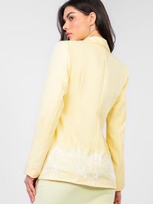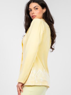 Μια κομψή γυναικεία σακακίδα με διαχρονικό, κομψό χαρακτήρα. Το απαλό σχέδιο καθιστά το μοντέλο ευέλικτο και εύκολα προσαρμόσιμο, συνδυάζεται τέλεια τόσο με κομψά παντελόνια, φούστες όσο και με τζιν σε πιο καθημερινή έκδοση. Το μοντέλο έχει κανονικό μήκος, με μακριά μανίκια, κλείνει μπροστά με κουμπί και τονίζει όμορφα τη σιλουέτα. Οι ραμμένες αφρώδεις μαξιλαράκια στους ώμους προσθέτουν σαφήνεια στην κατασκευή και σμιλεύουν διακριτικά τη γραμμή των ώμων, προσθέτοντας στην εμφάνιση επαγγελματικό χαρακτήρα. Η σακακίδα διαθέτει φόδρα, η οποία εξασφαλίζει άνετη εφαρμογή και είναι βολική στη χρήση. Στο κάτω μέρος έχει τελειώματα με διακοσμητική δαντέλα, που προσθέτει ένα θηλυκό, λεπτό στοιχείο και ξεχωρίζει το μοντέλο από τις κλασικές γραμμές. Κατασκευασμένη από ανθεκτό και ελαστικό μείγμα πολυεστέρα με προσθήκη ελαστάνης, προσφέρει άνεση και ελευθερία κινήσεων. Είναι η ιδανική επιλογή για τις γυναίκες που αναζητούν μια κομψή σακακίδα με διακριτικό, διακοσμητικό στοιχείο.