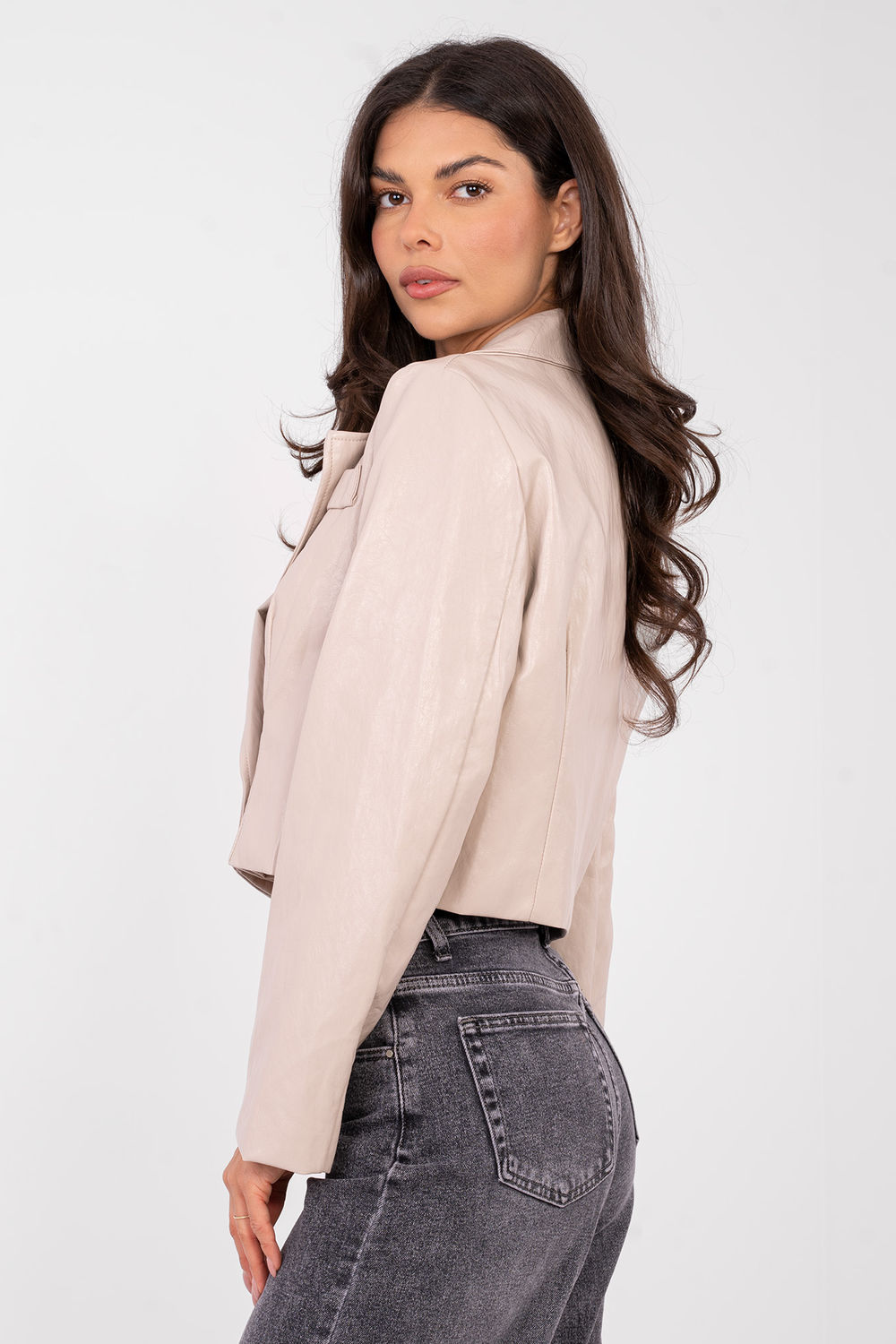 Στυλάτο γυναικείο σακάκι κατασκευασμένο από υψηλής ποιότητας οικολογικό δέρμα με βάση την βισκόζη και τον πολυουρεθάνη, ιδανικό για καθημερινές στυλιστικές επιλογές και για τη δουλειά. Ο καλλιεργούμενος χαρακτήρας του μοντέλου το καθιστά εξαιρετικά κατάλληλο για να συνδυάζει την κομψότητα με τον σύγχρονο, αστικό στυλ. Το λείο υλικό υπογραμμίζει την ευχρηστία του σακακιού και του προσδίδει διαχρονική εμφάνιση. Μοντέλο με κοντό μήκος, μακριά μανίκια και πέτα, κλείνει με κουμπιά σε διπλή διάταξη. Οι ραμμένες μαξιλαρίτσες στους ώμους τονίζουν διακριτικά τη γραμμή των ώμων και προσφέρουν εξαιρετική μορφή στη σιλουέτα. Το σακάκι διαθέτει επένδυση, που αυξάνει την άνεση κατά την φορεσιά. Η απουσία θερμής επένδυσης και γεμίσματος το καθιστά ιδανική επιλογή για την περίοδο του φθινοπώρου, του χειμώνα και της άνοιξης, τόσο για το γραφείο, όσο και για καθημερινή χρήση.