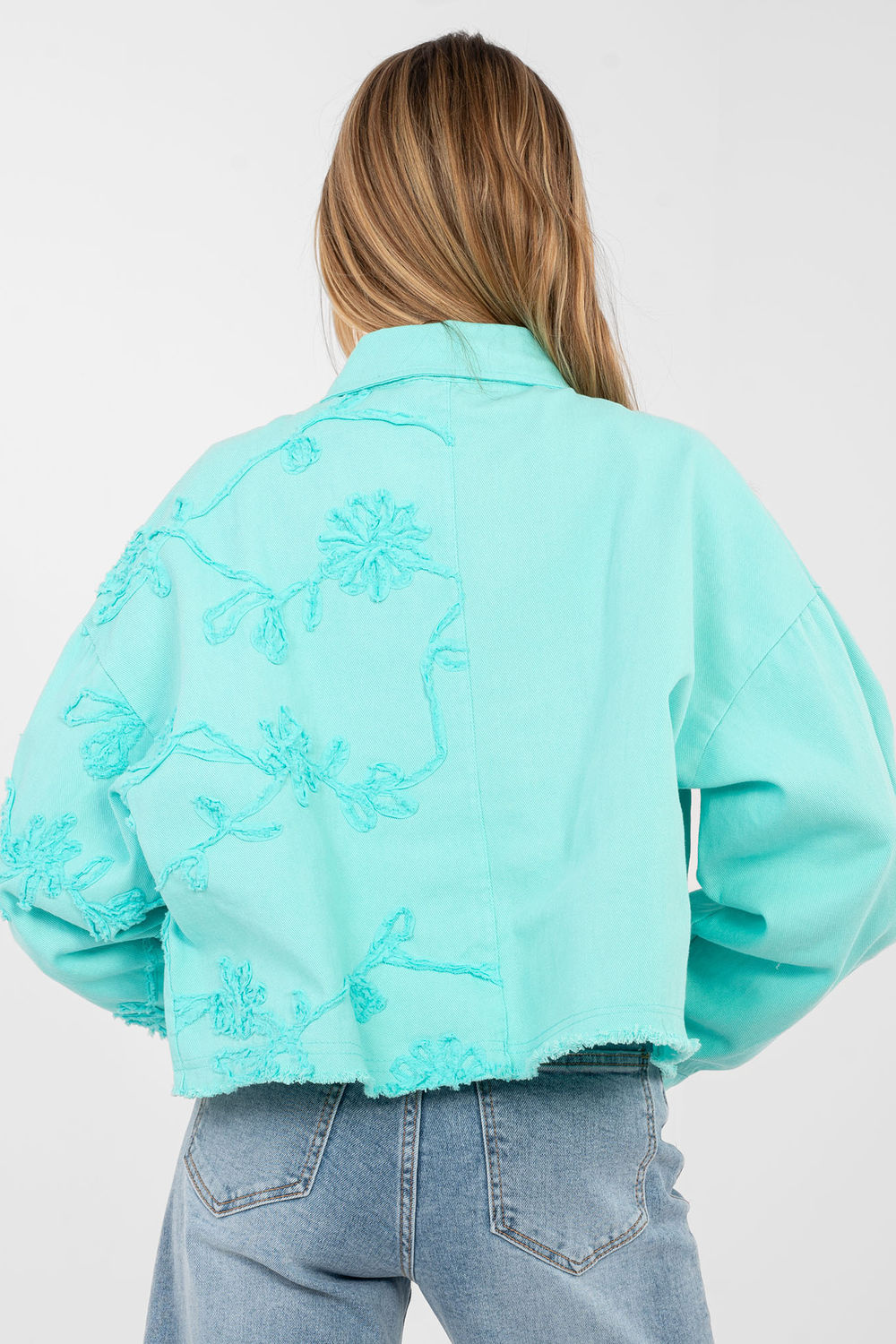 Μια στιλάτη γυναικεία τζιν τζάκετ σε casual μορφή, ιδανική για καθημερινή χρήση. Κατασκευασμένη από υψηλής ποιότητας βαμβάκι, εξασφαλίζει άνεση φθοράς και καθολικό χαρακτήρα. Μοντέλο κοντής μήκους με κλασικό γιακά και μακρύ μανίκι, κλείνει με κουμπιά. Το κάτω μέρος της τζάκετ τελειώνει με μοντέρνα ξεφτισμένα άκρα, που προσθέτει μια ελαφρώς ροκ πινελιά. Η πρωτοτυπία αυξάνεται με τις κεντημένες λουλούδια που βρίσκονται στην αριστερή πλευρά της τζάκετ στο μπροστινό μέρος, στο μανίκι και στην πλάτη, δημιουργώντας μια εντυπωσιακή και θηλυκή λεπτομέρεια. Η πρακτική τσέπη στη δεξιά πλευρά στο ύψος του στήθους υπογραμμίζει τον χρηστικό χαρακτήρα του μοντέλου. Εξαιρετική επιλογή για καθημερινές στυλιστικές προτάσεις, είτε με φορέματα, είτε με τζιν ή φούστες.