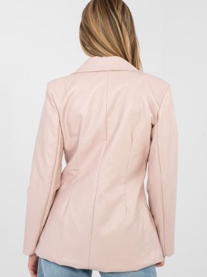 Κομψό γυναικείο σακάκι φτιαγμένο από υψηλής ποιότητας οικολογικό δέρμα με βάση την βισκόζη και το πολυουρεθάνιο, σχεδιασμένο για επίσημες στυλιστικές προτάσεις. Ο απλός ιστός αναδεικνύει τον σύγχρονο και διαχρονικό χαρακτήρα του μοντέλου, ενώ το κανονικό μήκος διασφαλίζει κλασικές αναλογίες. Το σακάκι διαθέτει πέτα και εντυπωσιακές αντίθετες πιέτες μπροστά, που προσδίδουν ευκρίνεια και κομψή μορφή στη σιλουέτα. Κλείνει με κουμπί, έχει κλείσιμο με φόδρα, εξασφαλίζοντας άνεση κατά την χρήση και αισθητική προσαρμογή. Οι ραμμένες μαξιλαροθήκες στους ώμους διαμορφώνουν διακριτικά τη γραμμή των ώμων, προσθέτοντας κομψότητα και επαγγελματική εμφάνιση. Είναι η ιδανική επιλογή για επίσημες και κομψές συνθέσεις, τόσο με παντελόνια όσο και με φούστες ή φορέματα.