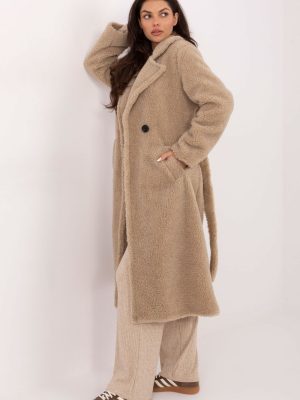 Ο στιλάτος γυναικείος παλτό τύπου πρόβατο είναι η ιδανική επιλογή για τις πιο κρύες ημέρες της σεζόν φθινόπωρο/χειμώνας. Διατηρημένος σε casual στυλ, είναι ιδανικός για καθημερινές περιστάσεις, εξασφαλίζοντας άνεση και μοντέρνα, διαχρονική εμφάνιση. Η ποικιλία της υφής του υλικού του προσδίδει έναν χαρακτηριστικό, μαλακό και αγκαλιαστικό αποτέλεσμα, τυπικό για τα παλτό τύπου πρόβατο. Το μοντέλο είναι κατασκευασμένο από υψηλής ποιότητας πολυέστερ, και η κατασκευή του δεν έχει επιπλέον θερμομόνωση, γεγονός που το καθιστά εξαιρετικά κατάλληλο ως ένα ελαφρύ, στιλάτο παλτό για ψυχρές, αλλά όχι ακραία κρύες ημέρες. Στο εσωτερικό υπάρχει επένδυση που βελτιώνει την άνεση κατά την χρήση και διευκολύνει την φόρεση. Το παλτό έχει μήκος μέχρι το γόνατο, προσθέτοντας κομψότητα και προστατεύοντας καλά από το κρύο. Το μακρύ μανίκι, ο ευρύς γιακάς και οι χυτές καπνιστές λεπτομέρειες υπογραμμίζουν τον σύγχρονο χαρακτήρα του. Στο μπροστινό μέρος υπάρχει διπλό κούμπωμα με κουμπιά, συμπληρωμένο από μια πρακτική ζώνη στη μέση, που επιτρέπει την προσαρμογή της γραμμής στο σχήμα του σώματος και τονίζει τη μέση. Ένα επιπλέον πλεονέκτημα είναι οι αναβατόντες τσέπες, ιδανικές για μικροαντικείμενα ή για να κρατήσουν τα χέρια ζεστά. Είναι ένα στιλάτο, εντυπωσιακό και άνετο παλτό που θα ολοκληρώσει τέλεια τις φθινωπορινές και χειμερινές εμφανίσεις.
