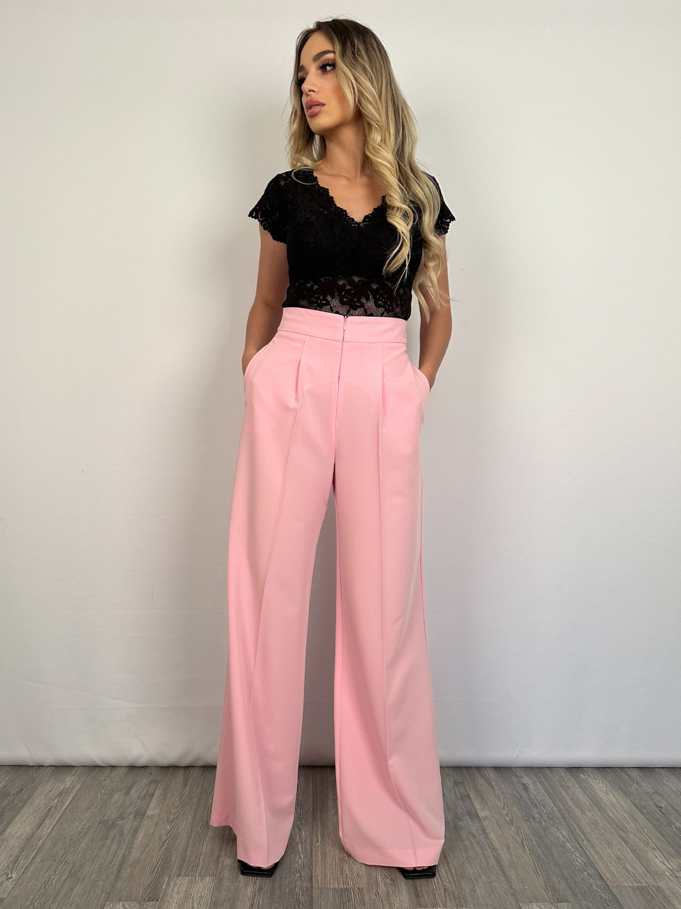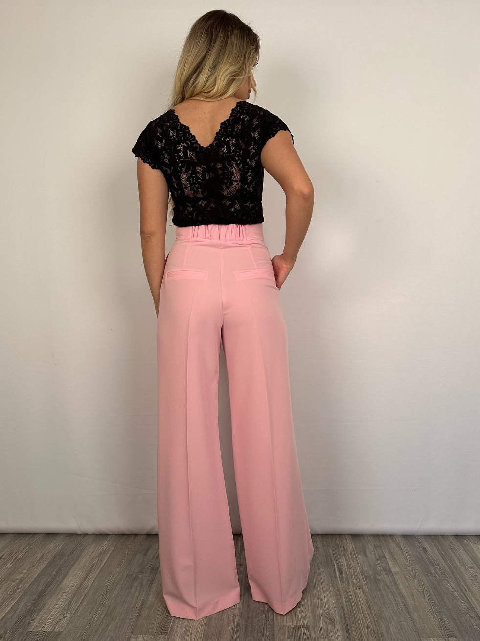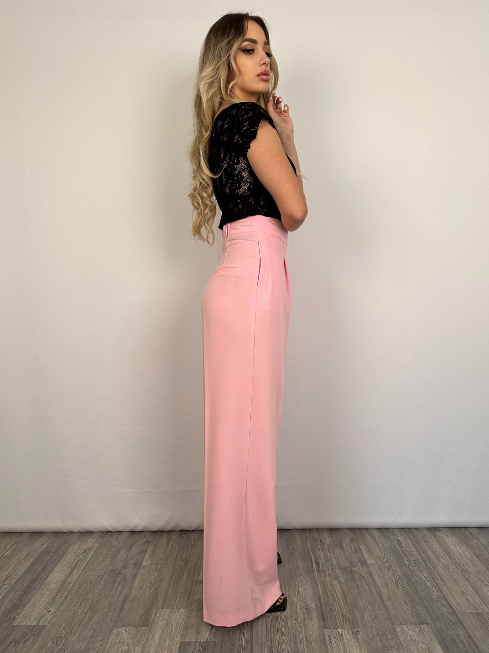 Παντελόνα ψηλόμεση σε ροζ χρώμα, με λάστιχο στη μέση στο πίσω μέρος, διακοσμητικές τσέπες στο πίσω μέρος, και τσέπες στο πλάϊ. Ελληνικής εταιρείας