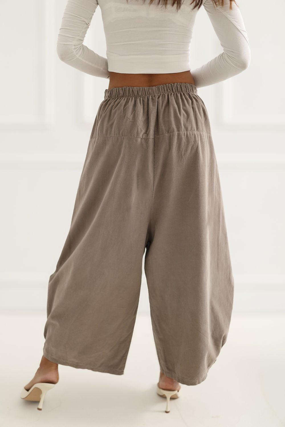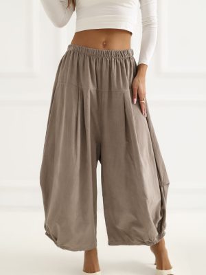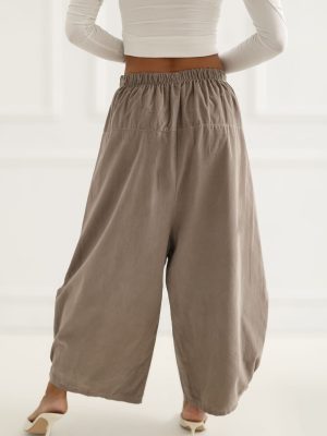 Γυναικείο παντελόνι από χοντρό ύφασμα σε ελεύθερη γραμμή τύπου αλαδίνης, ιδανικό για καθημερινή χρήση. Κατασκευασμένο από μαλακό και ευχάριστο στην αίσθηση βαμβάκι, παρέχει άνεση στη χρήση και διαπνοή. Μοντέλο με ψηλή μέση και ραμμένο λάστιχο στη μέση, που προσαρμόζεται στη σιλουέτα και εγγυάται άνεση καθ’ όλη τη διάρκεια της ημέρας. Φαρδιές οι μπατζάκια μήκους 7/8 δίνουν μια αίσθηση ελαφρότητας και μοντέρνου χαρακτήρα. Παντελόνι με ομοιόμορφο σχέδιο, χωρίς κλείσιμο και τσέπες, που υπογραμμίζει το μινιμαλιστικό στιλ του και την άνετη, ανεπίσημη εμφάνιση.