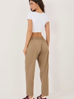 Οι παντελόνες από κοτλέ τύπου paperbag είναι μια κομψή και άνετη πρόταση για την καθημερινότητα και για τη δουλειά. Η ψηλή μέση με εσωτερική ελαστική ζώνη αναδεικνύει όμορφα τη μέση, παρέχοντας ταυτόχρονα άνεση και ιδανική εφαρμογή στο σώμα. Το μοντέλο διαθέτει μακριά, ελαφρώς φαρδιά πόδια, που οπτικά επιμηκύνουν τα πόδια και προσθέτουν μοντέρνο χαρακτήρα σε όλη την εμφάνιση. Ο λείος ύφασμα με υφή κοτλέ, κατασκευασμένος από πολυέστερ, είναι ευχάριστος στην αφή και πρακτικός στη χρήση. Οι παντελόνες δεν διαθέτουν κλασικό κλείσιμο, γεγονός που αυξάνει την άνεση και διευκολύνει την τοποθέτησή τους. Οι λειτουργικές, πλαϊνές τσέπες προσθέτουν πρακτικότητα στην καθημερινή χρήση. Είναι ένα καθολικό μοντέλο που συνδυάζει τη μοντέρνα εμφάνιση με την άνεση, ιδανικό για πολλές στυλιστικές επιλογές.