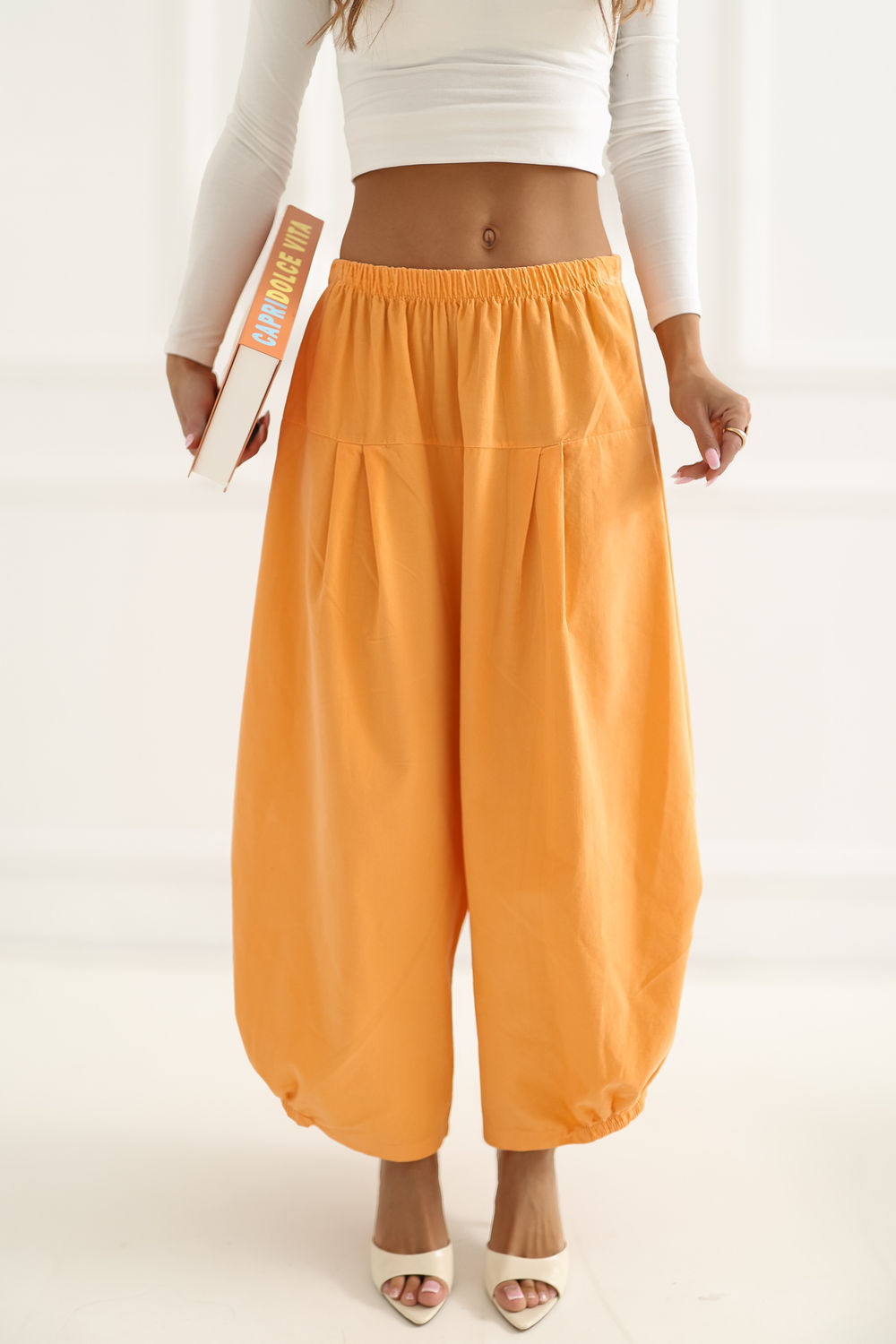 Γυναικείο παντελόνι από χοντρό ύφασμα σε χαλαρή γραμμή τύπου αλαδίνης, ιδανικό για καθημερινή χρήση. Κατασκευασμένο από μαλακή και ευχάριστη στην αφή βαμβακερή ύφασμα, προσφέρει άνεση και διαπερατότητα. Μοντέλο με ψηλή μέση και λάστιχο ραμμένο στη μέση, που προσαρμόζεται στη σιλουέτα και εγγυάται άνεση καθ’ όλη τη διάρκεια της ημέρας. Φαρδιές μπατζάκια μήκους 7/8 προσδίδουν ελαφρότητα και μοντέρνα αίσθηση στο σύνολο. Παντελόνι σε μονόχρωμο σχέδιο, χωρίς κλείσιμο και τσέπες, κάτι που αναδεικνύει το μινιμαλιστικό στυλ και την χαλαρή, ανεπιτήδευτη εμφάνιση.