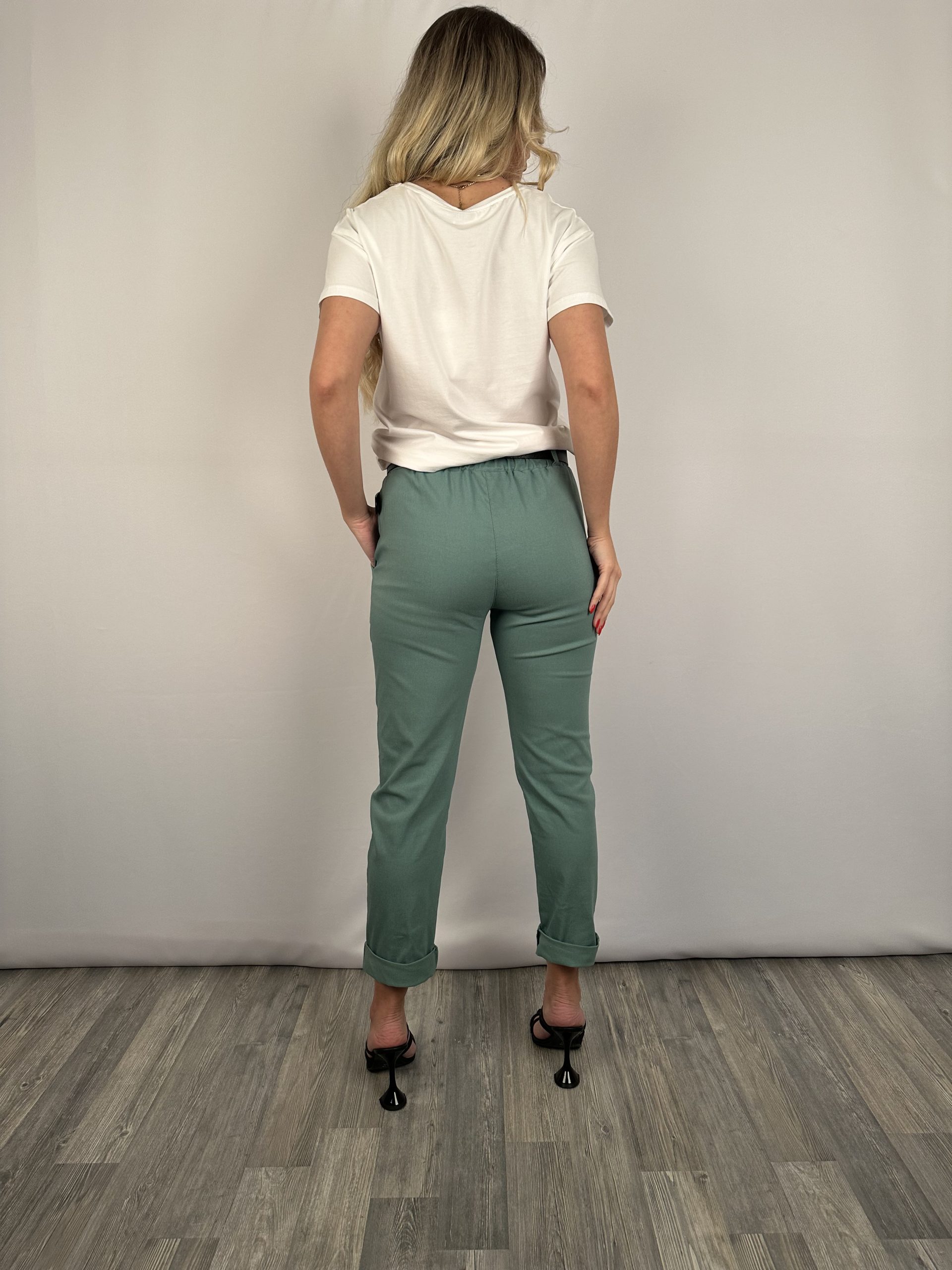 Παντελόνι τύπου τζιν με λάστιχο στη μέση, τσέπες στο πλάϊ, ρεβέρ στο τελείωμα. Διαθέτει ζώνη δερματίνη.