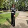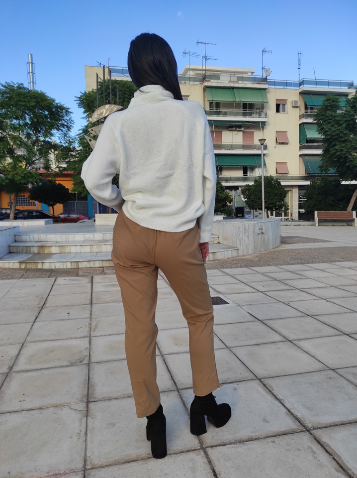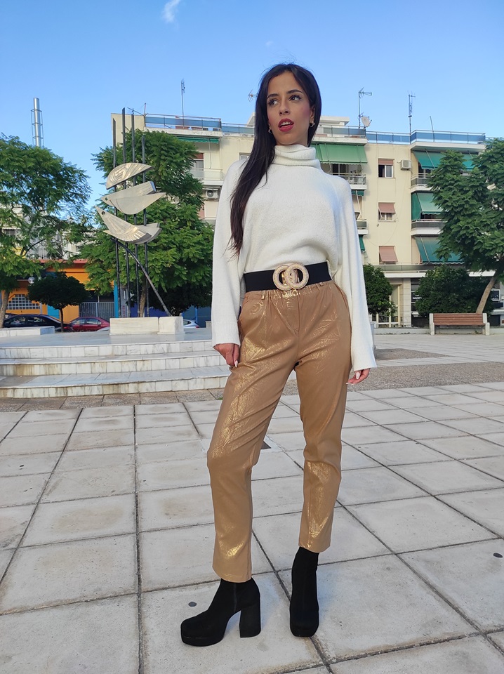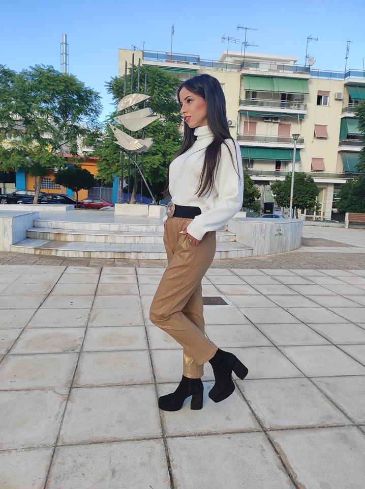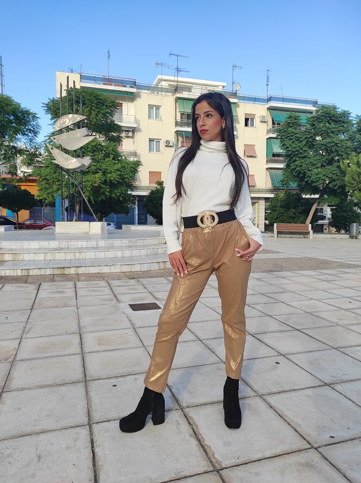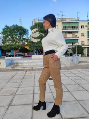 Ψηλόμεσο ελαστικό παντελόνι τύπου mom, σε άνετη γραμμή, με σούρα στη μέση και χρυσό τύπωμα.
