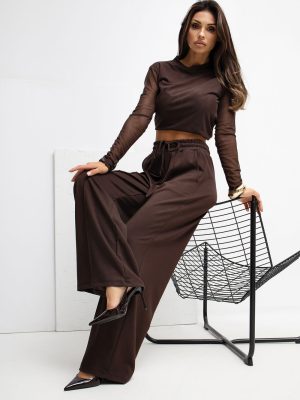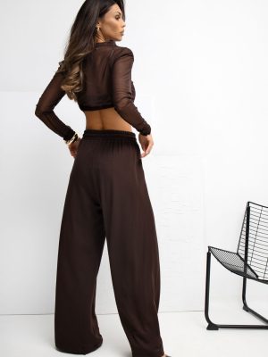 Μαλακά παντελόνια τύπου palazzo κατασκευασμένα από υλικό βουτυράκι, εξαιρετικά λεπτό, ελαστικό και ιδιαίτερα ευχάριστο στην αφή. Χάρη στη ψηλή μέση και τις φαρδιές γραμμές, το μοντέλο αποδίδει υπέροχα στη σιλουέτα, προσφέροντας ταυτόχρονα πλήρη άνεση κατά την χρήση. Στην μπροστινή πλευρά υπάρχουν διακριτές, διακοσμητικές ραφές, που προσθέτουν μια κομψή αίσθηση στα παντελόνια και οπτικά επιμηκύνουν τα πόδια. Στη μέση υπάρχει άνετη ρύθμιση, που επιτρέπει την τέλεια προσαρμογή στην φιγούρα, ενώ οι πλαϊνές τσέπες αναδεικνύουν το casual στυλ και τη λειτουργικότητα του μοντέλου. Το λείο υλικό με προσθήκες ελαστάνης και υπεροχή βισκόζης εξασφαλίζει ότι τα παντελόνια είναι αναπνεύσιμα, ελαστικά και θα ανταποκριθούν τέλεια σε καθημερινές εμφανίσεις, τόσο για δουλειά όσο και για καθημερινές περιστάσεις. Ιδανική επιλογή για άτομα που εκτιμούν την άνεση σε συνδυασμό με έναν μοντέρνο, μινιμαλιστικό στιλ.
