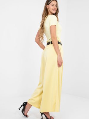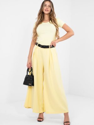 Οι κομψές παντελόνες τύπου palazzo είναι ένας συνδυασμός άνεσης και κομψότητας σε μοντέρνα έκδοση. Κατασκευασμένες από υψηλής ποιότητας μείγμα βισκόζης, πολυεστέρα και ελαστάνης, εντυπωσιάζουν με τον πολύ μαλακό, λεπτό και εξαιρετικά ευχάριστο στην αφή ύφασμα. Το υλικό αναδεικνύει όμορφα τη σιλουέτα, εξασφαλίζοντας άνεση όλη την ημέρα. Το μοντέλο με ψηλή μέση διαθέτει ελαστική ταινία στη μέση, που εγγυάται τέλεια εφαρμογή χωρίς αίσθηση πνιγμού. Επιπλέον, η προσθήκη ζώνης με κούμπωμα τονίζει τη μέση και προσδίδει συνολικά κομψό χαρακτήρα. Η απουσία κλασικού κουμπώματος αυξάνει την άνεση χρήσης. Οι φαρδιές κοτσίδες τύπου palazzo προσδίδουν ελαφρότητα και ελευθερία στη σιλουέτα, ενώ οι διακοσμητικές πτυχές μπροστά προσθέτουν μια εκλεπτυσμένη αίσθηση στα παντελόνια. Το λείο σχέδιο καθιστά το μοντέλο универсаль ينبع του από τέλειες προσαρμογές και στυλ τόσο για καθημερινές εμφανίσεις όσο και για την εργασία. Οι πλαϊνές, ενσωματωμένες τσέπες ενισχύουν τη λειτουργικότητα, συνδυάζοντας την πρακτικότητα με το κομψό στυλ.