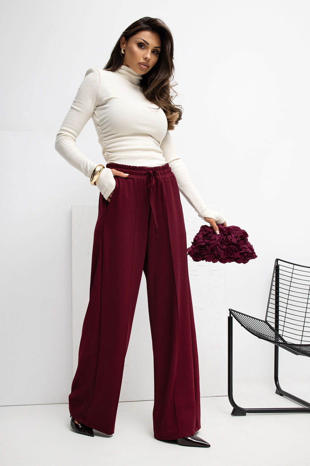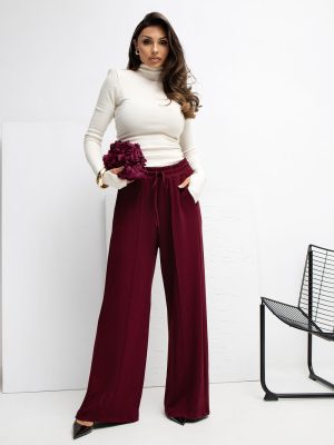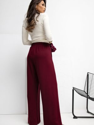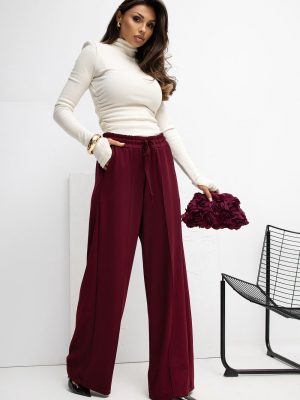 Μαλακές παντελόνες φόρμας τύπου παλάτσο, κατασκευασμένες από ένα εξαιρετικά απαλό, ελαστικό και πολύ ευχάριστο ύφασμα. Χάρη στη ψηλή μέση και τα φαρδιά παντελόνια, το μοντέλο ταιριάζει υπέροχα στη σιλουέτα, προσφέροντας παράλληλα πλήρη άνεση κατά τη διάρκεια της χρήσης. Στο μπροστινό μέρος υπάρχουν διακριτικές, διακοσμητικές ραφές που προσθέτουν στην κομψότητα των παντελονιών και οπτικά μακραίνουν τα πόδια. Στη μέση έχει χρησιμοποιηθεί βολικό δέσιμο, που επιτρέπει την τέλεια προσαρμογή στη σιλουέτα, ενώ οι πλευρικές τσέπες αναδεικνύουν το casual στυλ και τη λειτουργικότητα του μοντέλου. Το λείο ύφασμα με προσθήκη ελαστάνης και πλεονέκτημα βισκόζης καθιστά τα παντελόνια αναπνεύσιμα, ελαστικά και ιδανικά για καθημερινές εμφανίσεις, τόσο για τη δουλειά όσο και για καθημερινές περιστάσεις. Ιδανική επιλογή για άτομα που εκτιμούν την άνεση σε συνδυασμό με μοντέρνο, μινιμαλιστικό στυλ.