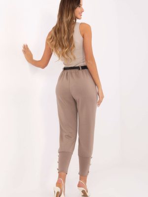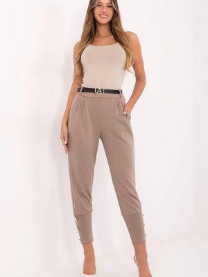 Μοντέρνα και άνετα γυναικεία παντελόνια φόρμας σε casual στυλ, ιδανικά για καθημερινή χρήση και για εργασία σε χαλαρή έκδοση. Κατασκευασμένα από ένα ευχάριστο στην αφή μείγμα βισκόζης και πολυεστέρα, εγγυώνται άνεση στη φθορά και κομψή, καλαίσθητη εμφάνιση. Το μοντέλο με ψηλή μέση και στενά μπατζάκια αναδεικνύει τέλεια τη σιλουέτα, προσφέροντας ταυτόχρονα ελευθερία κινήσεων. Στη μέση στο πίσω μέρος υπάρχει ελαστική ζώνη, χάρη στην οποία τα παντελόνια προσαρμόζονται τέλεια στη σιλουέτα. Για μεγαλύτερη λειτουργικότητα, είναι εξοπλισμένα με πλαϊνές τσέπες και η ζώνη με κούμπωμα επιτρέπει μια διακριτική τόνωση της μέσης. Στο κάτω μέρος των μπατζακιών υπάρχουν φαρδιές ελαστικές μάνσες με διακοσμητικά κουμπιά, που προσθέτουν στυλ σε όλο το σύνολο. Είναι μια εξαιρετική επιλογή για γυναίκες που εκτιμούν τον συνδυασμό άνεσης και αστικής κομψότητας, ιδανικά για εργασία, βόλτες ή συναντήσεις με φίλους.