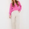 Μαλακά παντελόνια φόρμας κατασκευασμένα από ύφασμα τύπου βούτυρο, ιδιαίτερα λεπτό, ελαστικό και ευχάριστο στην αφή. Το μοντέλο χαρακτηρίζεται από ψηλή μέση και φαρδιές, καμπάνα παντελόνες, οι οποίες δίνουν στη στυλιστική πρόταση έναν χαλαρό, ελαφρώς ρετρό χαρακτήρα. Στη μέση έχει ραμμένο ελαστικό λάστιχο που διασφαλίζει την ιδανική εφαρμογή και άνεση κατά τη διάρκεια της ημέρας. Στο μπροστινό μέρος έχουν τοποθετηθεί διακοσμητικές ραφές που εκτείνονται σε όλο το μήκος των παντελονών, οι οποίες οπτικά επιμηκύνουν τη σιλουέτα και προσθέτουν μία κομψή φινέτσα. Τα παντελόνια είναι εξαιρετικά για καθημερινές, casual στυλιστικές προτάσεις τόσο για τη δουλειά όσο και για την καθημερινότητα. Το ομαλό ύφασμα από βισκόζη και ελαστάν προσφέρει άνεση, διαπνοή και όμορφη εφαρμογή στη σιλουέτα. Μοντέλο χωρίς κλείσιμο και χωρίς τσέπες, σχεδιασμένο με γνώμονα τη μέγιστη άνεση και τον μινιμαλιστικό στυλ.
