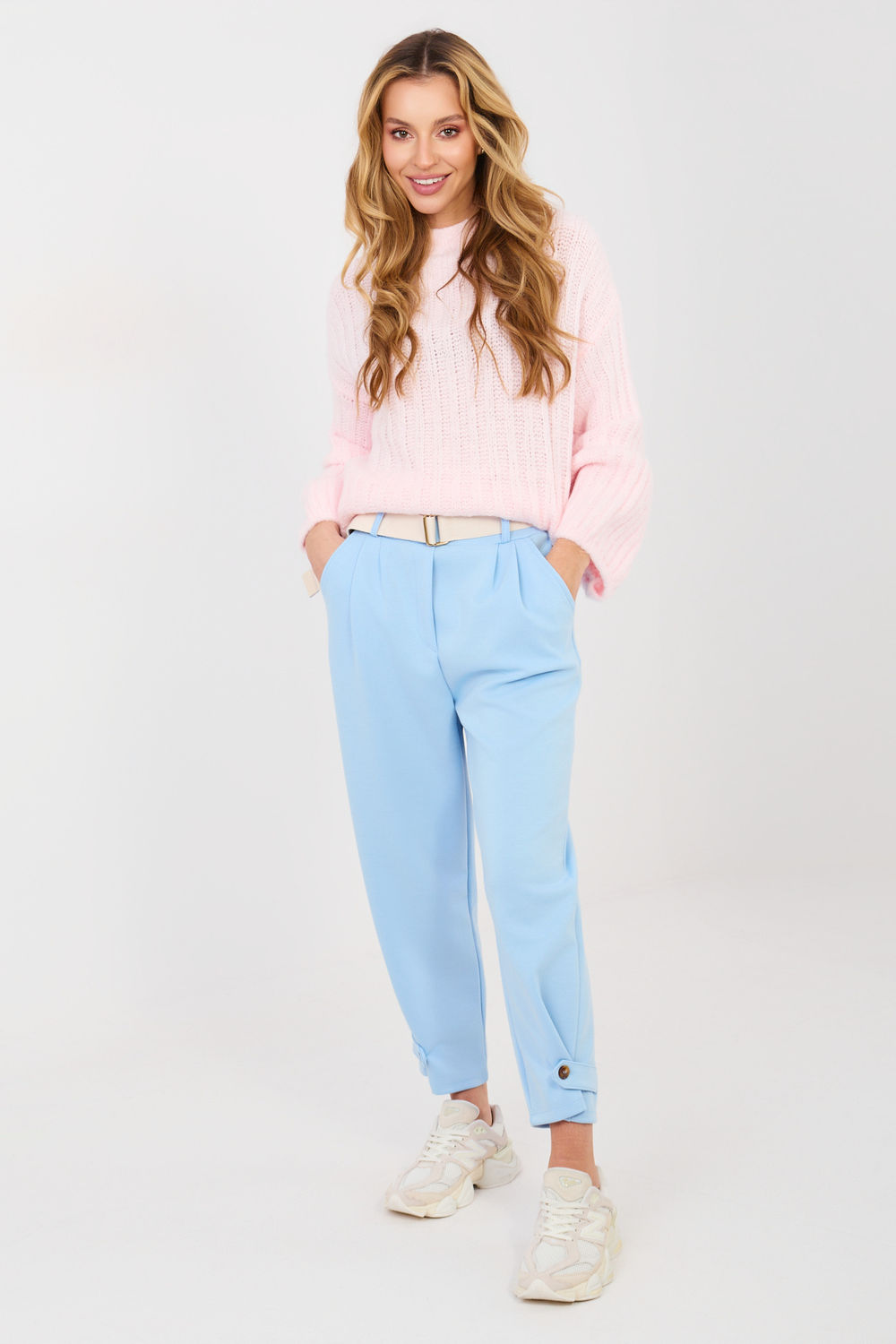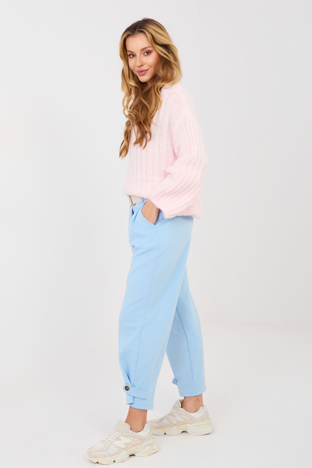 Γυναικείο παντελόνι φόρμας σε στυλ casual, σχεδιασμένο για άνεση κατά την καθημερινή χρήση. Το μοντέλο με λείο σχέδιο ταιριάζει ιδανικά σε χαλαρές στυλιστικές επιλογές, είτε για περίπατο, αγορές, είτε για χαλάρωση στο σπίτι. Το παντελόνι είναι κατασκευασμένο από εξαιρετικά ευχάριστο στην αφή ύφασμα τύπου «βούτυρο». Είναι ένα μαλακό, λεπτό και ελαστικό ύφασμα που είναι συνδυασμός βισκόζης, ελαστάνης και βαμβακιού, προσφέροντας υψηλή άνεση κατά την εφαρμογή και εφαρμόζοντας τέλεια στη σιλουέτα. Το μοντέλο διαθέτει ψηλή μέση και ελαστική ζώνη ραμμένη στη μέση, διασφαλίζοντας άνετη εφαρμογή. Επιπλέον, στη μέση υπάρχει μια ζώνη με άνοιγμα που αποτελεί πρακτική και κομψή λεπτομέρεια. Το παντελόνι είναι εξοπλισμένο με πλάγιες, ανοιχτές τσέπες. Οι μανίκες μήκους 7/8 έχουν στενό κόψιμο που αναδεικνύει τη σιλουέτα. Στο κάτω μέρος των μανικιών υπάρχουν ζώνες με κούμπωμα, που επιτρέπουν τη ρύθμιση της περιφέρειας των μανικιών και την προσαρμογή τους σύμφωνα με τις δικές σας προτιμήσεις. Το μοντέλο χωρίς κλασικό κλείσιμο είναι εύκολο και άνετο στην τοποθέτηση.