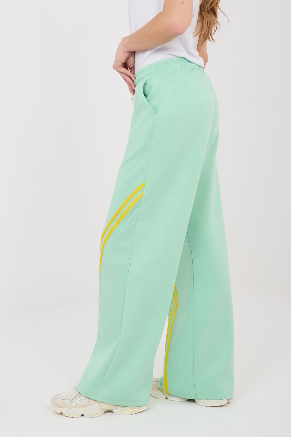 Τα γυναικεία παντελόνια φόρμας είναι μια άνετη και στυλάτη πρόταση για καθημερινή χρήση, ιδανική για γυναίκες που εκτιμούν την άνεση και την κομψή, casual εμφάνιση. Είναι ιδανικά για καθημερινές δραστηριότητες, περιπάτους, ψώνια ή χαλάρωση στο σπίτι. Το μοντέλο είναι φτιαγμένο από ένα ευχάριστο υλικό που συνδυάζει: πολυεστέρα, βισκόζη και ελαστάνη. Χάρη σε αυτό, τα παντελόνια είναι απαλά, ελαστικά και προσαρμόζονται καλά στη σιλουέτα, εξασφαλίζοντας πλήρη ελευθερία κινήσεων. Τα παντελόνια έχουν ψηλή μέση που εξασφαλίζει άνεση κατά τη διάρκεια της χρήσης και τονίζει όμορφα τη μέση. Στη μέση υπάρχει μια πρακτική κορδέλα για ατομική προσαρμογή στη σιλουέτα. Στο πλάι υπάρχουν λειτουργικές τσέπες, ιδανικές για μικρά αντικείμενα. Το λείο υλικό δίνει στα παντελόνια έναν καθολικό χαρακτήρα, ενώ ένα μοντέρνο στοιχείο είναι οι λοξές ρίγες που βρίσκονται μπροστά από τα πόδια, οι οποίες προσθέτουν μια σύγχρονη και σπορ-κομψή αίσθηση. Είναι μια εξαιρετική επιλογή για γυναίκες που θέλουν να συνδυάσουν την άνεση των φόρμας με μια μοντέρνα, καθημερινή εμφάνιση.