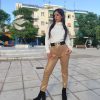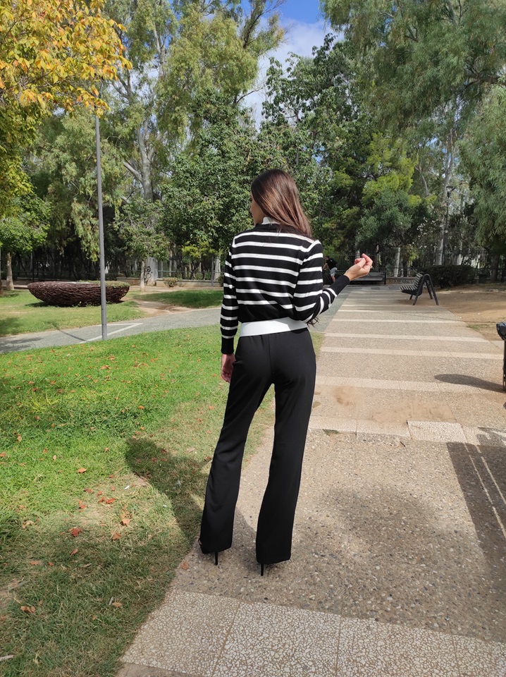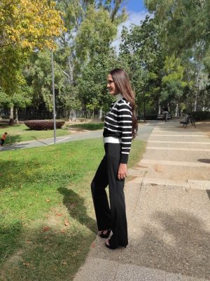 Μαύρο ελαστικό παντελόνι καμπάνα με διακοσμητικές τσέπες και λάστιχο στη μέση.