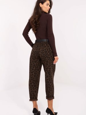 Γυναικεία παντελόνια υφασμάτινα σε casual στυλ, ιδανικά για καθημερινή χρήση. Κατασκευασμένα από μείγμα βισκόζης, πολυεστέρα και ελαστάνης, συνδυάζουν άνεση με ευελιξία και ανθεκτικότητα. Το μοντέλο με ψηλόμεση μέση, κωνικές γραμμές και ελαστική ζώνη στη μέση εξασφαλίζει άνεση κατά την διάρκεια της χρήσης, ενώ η ζώνη με κούμπωμα τονίζει τη μέση. Πλαϊνές τσέπες και μοντέρνο ζωικό μοτίβο σε όλο το ύφασμα προσδίδουν στα παντελόνια σύγχρονο και έντονο χαρακτήρα.