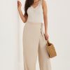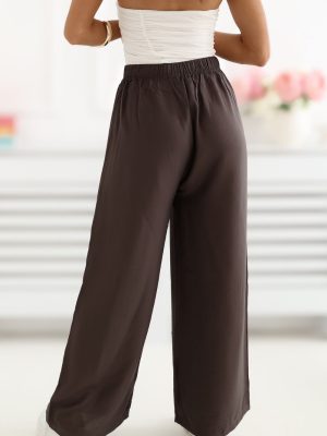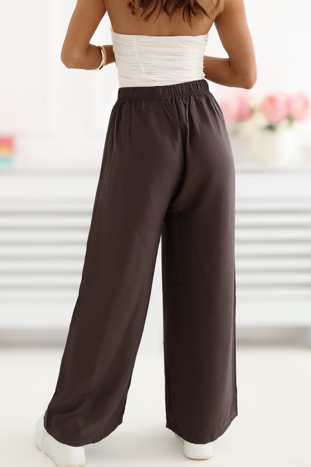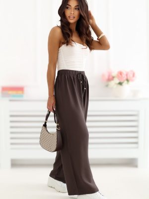 Τα γυναικεία παν trousers τύπου wide leg είναι μια άνετη και στιλάτη πρόταση για καθημερινή χρήση. Το μοντέλο με φαρδιά, μακριά ποδόγρυλλα προσαρμόζεται όμορφα στο σώμα, εξασφαλίζοντας ελευθερία κινήσεων και μια μοντέρνα, ελαφρώς αδέξια εμφάνιση. Το ομαλό σχέδιο καθιστά τα παν trousers εξαιρετικά ευέλικτα και εύκολα στη στυλιστική τους χρήση, καθώς ταιριάζουν άψογα τόσο με casual όσο και με πιο θηλυκά κομμάτια της γκαρνταρόμπας. Η ψηλή μέση τονίζει τη μέση, ενώ το δέσιμο στη μέση επιτρέπει την ατομική προσαρμογή και αυξάνει την άνεση στη φθορά. Κατασκευασμένα από μίγμα βισκόζης και πολυαμιδίου, τα παν trousers είναι ελαφριά, ευχάριστα στην αφή και προσαρμόζονται καλά στο σώμα. Η έλλειψη τσεπών υπογραμμίζει τον μινιμαλιστικό τους χαρακτήρα, προσδίδοντας συνολικά μια κομψή φινέτσα. Είναι η ιδανική επιλογή για γυναίκες που εκτιμούν την άνεση, την απλότητα και το διαχρονικό στυλ στις καθημερινές τους εμφανίσεις. Σημειώσεις: Το μέγεθος στη ετικέτα είναι M/L, ωστόσο το μοντέλο φαίνεται μικρότερο, αντιστοιχεί σε μέγεθος S/M (μειωμένο).