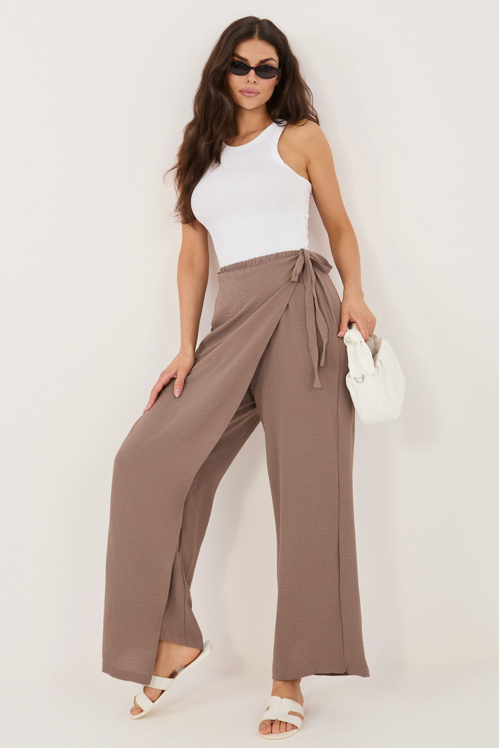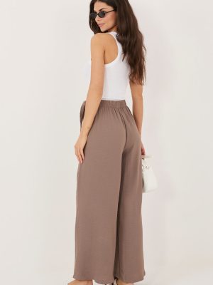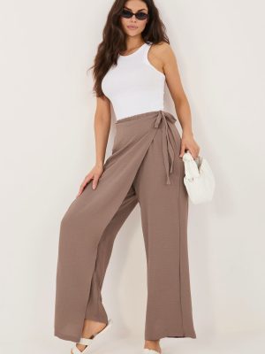 Τα γυναικεία παντελόνια τύπου wide leg είναι μια κομψή και άνετη πρόταση για καθημερινή χρήση και για λιγότερο επίσημες εργασιακές περιστάσεις. Η φαρδιά σιλουέτα τους με τις πλατιές, μακρές ποδιές προσφέρει ελαφρότητα στη σιλουέτα και σύγχρονο χαρακτήρα, ενώ ταυτόχρονα εξασφαλίζει πλήρη ελευθερία κινήσεων. Το μοντέλο διαθέτει ψηλή μέση με ραμμένο λάστιχο, που εγγυάται άνεση στη φορεσιά και καλή εφαρμογή στο σώμα. Το λείο σχέδιο υπογραμμίζει την ευχρηστία του παντελονιού, διευκολύνοντας τον συνδυασμό του με διάφορα κομμάτια της γκαρνταρόμπας. Κατασκευασμένα από ευχάριστο στην αίσθηση μείγμα βισκόζης και ελαστάνης, τα παντελόνια είναι μαλακά, ελαστικά και εφαρμόζουν καλά στο σώμα. Ένα μοναδικό στοιχείο είναι ο υφασμάτινος φιόγκος που προσομοιώνει το μπροστινό μέρος της φούστας, στερεωμένος μέσω δέσιμος στη μέση, ο οποίος προσθέτει στη συνολική εμφάνιση έναν ασυνήθιστο, μοντέρνο χαρακτήρα. Το μοντέλο χωρίς τσέπες διατηρεί την μινιμαλιστική του μορφή, ιδανικό για κομψές και casual στυλιστικές προτάσεις. Είναι εξαιρετική επιλογή για γυναίκες που εκτιμούν την άνεση και το σύγχρονο σχέδιο. Σημειώσεις: Το μέγεθος της ετικέτας είναι M/L, ωστόσο το μοντέλο βγαίνει μικρότερο, αντιστοιχώντας σε μέγεθος S/M (μειωμένο).