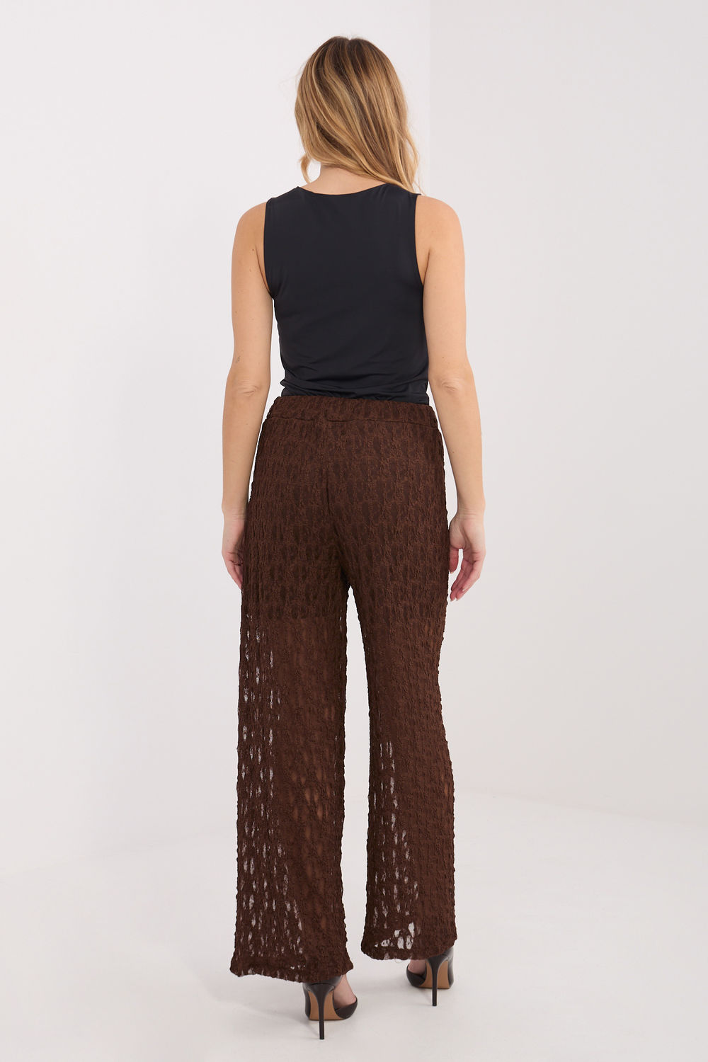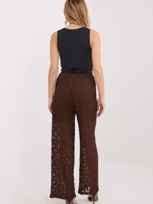 Οι κομψές γυναικείες παντελόνες με δαντέλα τύπου wide leg είναι μια στυλάτη πρόταση που θα ταιριάξει τέλεια τόσο για καθημερινές εμφανίσεις όσο και για επισκέψεις ή πάρτι. Το μοντέλο συνδυάζει άνεση στη χρήση με ένα ιδιαίτερο, γυναικείο σχέδιο. Τα παντελόνια είναι κατασκευασμένα από ένα μείγμα βισκόζης και ελαστάνης, που εξασφαλίζει απαλότητα, ελαστικότητα και άνετη εφαρμογή στο σώμα. Η πολυδιάστατη υφή του υλικού δίνει σε όλο το σύνολο μια κομψή αίσθηση και υπογραμμίζει το διακοσμητικό στυλ της δαντέλας. Η ψηλή μέση και η ελαστική ζώνη στη μέση αναδεικνύουν όμορφα τη μέση και εξασφαλίζουν άνεση όλη μέρα. Οι φαρδιές καμπάνες τύπου wide leg οπτικά μακραίνουν τα πόδια και προσδίδουν στην σιλουέτα μια αίσθηση ελαφρότητας. Το μοντέλο δεν έχει κλείσιμο και φοριέται από τους γοφούς, είναι πρακτικό και άνετο στη χρήση. Η επένδυση στην άνω πλευρά εξασφαλίζει κατάλληλη κάλυψη και άνεση κατά τη διάρκεια της χρήσης, χωρίς να θολώνει την λεπτεπίλεπτη εμφάνιση του υλικού. Είναι μια εξαιρετική επιλογή για γυναίκες που θέλουν να συνδυάσουν την κομψότητα με ένα σύγχρονο στυλ και άνεση.