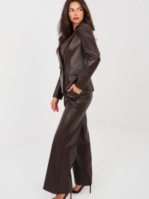 Στυλάτες γυναικείες παντελόνες από οικολογικό δέρμα με σχέδιο wide leg είναι μια μοντέρνα και ευέλικτη πρόταση για καθημερινές εμφανίσεις και για το γραφείο. Κατασκευασμένες από υλικό υψηλής ποιότητας που αποτελεί συνδυασμό βισκόζης και πολυουρεθάνης, συνδυάζουν τον εντυπωσιακό σχεδιασμό με την άνεση της χρήσης. Το μοντέλο με λεία υφή και ψηλή μέση αναδεικνύει όμορφα την μέση και οπτικά μακραίνει τη σιλουέτα. Οι φαρδιές μασχάλες προσδίδουν στο παντελόνι έναν σύγχρονο, ελεύθερο χαρακτήρα και εξασφαλίζουν άνεση κατά τη χρήση. Οι πρακτικές πλαϊνές τσέπες ενισχύουν τη λειτουργικότητα του μοντέλου. Το παντελόνι κλείνει με φερμουάρ και κουμπί, γεγονός που εγγυάται καλή εφαρμογή και σταθερότητα. Ιδανικό να συνδυαστεί τόσο με μια κομψή μπλούζα και σακάκι, όσο και με ένα casual πουλόβερ ή τοπ.