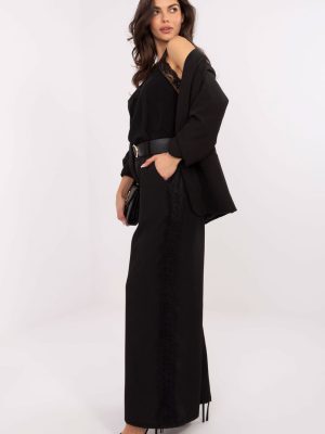 Τα κομψά γυναικεία παντελόνια από ύφασμα είναι ένας συνδυασμός άνεσης και κομψής εμφάνισης, ιδανικά για καθημερινές στυλιστικές επιλογές καθώς και για τη δουλειά. Το μοντέλο με ομαλή επιφάνεια διευκολύνει την συνδυαστικότητα με διάφορα κορυφαία τμήματα της γκαρνταρόμπας, δημιουργώντας τόσο casual όσο και πιο κομψές συνθέσεις. Τα παντελόνια έχουν υψηλή μέση με συρραμμένη ελαστικότητα στη μέση, γεγονός που εξασφαλίζει άνεση και τέλεια προσαρμογή στη σιλουέτα. Οι φαρδιές γραμμές διασφαλίζουν άνετη εφαρμογή, ενώ οι πλαινές, εισερχόμενες τσέπες προσθέτουν πρακτικότητα. Επιπλέον, το μοντέλο είναι εξοπλισμένο με ζώνη που κλείνει και λεπτό δαντέλα ραμμένο κατά μήκος των ποδιών, δίνοντας στα παντελόνια έναν μοναδικό, θηλυκό χαρακτήρα. Κατασκευασμένα από υψηλής ποιότητας μείγμα βισκόζης και ελαστάνης, τα παντελόνια είναι μαλακά, ελαστικά και ανθεκτικά, εξασφαλίζοντας άνεση καθ’ όλη τη διάρκεια της ημέρας. Είναι η ιδανική επιλογή για γυναίκες που εκτιμούν την κομψότητα σε συνδυασμό με άνεση και πρωτότυπες λεπτομέρειες.