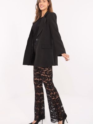 Stylish παντελόνια από δαντέλα σε γραμμή καμπάνα, που συνδυάζουν την κομψότητα με έναν μοναδικό, γυναικείο χαρακτήρα. Κατασκευασμένα από μείγμα υψηλής ποιότητας πολυεστέρα, ελαστάνης και βισκόζης, είναι ελαφριά, ευχάριστα στην αφή και προσφέρουν άνεση κατά τη διάρκεια της χρήσης. Το μοντέλο διαθέτει ψηλή μέση με ελαστική ζώνη, που εγγυάται την ιδανική εφαρμογή στο κορμί, ενώ οι φαρδιές καμπάνες προσθέτουν ελαφρότητα και εντυπωσιακή εμφάνιση στα παντελόνια. Όλο το σύνολο είναι κατασκευασμένο από διαφανές υλικό, με επένδυση στο πάνω μέρος, εξασφαλίζοντας άνεση και διακριτική κάλυψη, διατηρώντας παράλληλα την κομψή φύση των παντελονιών. Η απουσία κλείσιματος και τσεπών τονίζει την απλότητα και το κομψό στυλ. Είναι μια εξαιρετική επιλογή για επίσημες περιστάσεις και εκδηλώσεις, όταν θέλεις να φαίνεσαι εντυπωσιακή και γυναίκα.