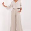 Άνετο και στυλάτο γυναικείο παντελόνι από καμισό ύφασμα σε χαλαρή γραμμή, ιδανικό για καθημερινή χρήση. Κατασκευασμένο από μαλακό πολυεστέρα, παρέχει άνεση κατά τη διάρκεια της χρήσης και ελευθερία κινήσεων. Το μοντέλο διαθέτει ψηλή μέση με ραμμένη ελαστική ταινία, γεγονός που του επιτρέπει να προσαρμόζεται τέλεια στη σιλουέτα και να τονίζει τη μέση. Το παντελόνι έχει πλαϊνές τσέπες και ανοιχτές τσέπες στο πίσω μέρος, προσθέτοντας πρακτικότητα. Το σύνολο συμπληρώνεται από μια ζώνη που κλείνει στη μέση, αποτελώντας μια μοντέρνα και λειτουργική λεπτομέρεια. Το λείο ύφασμα και οι φαρδιές ποδιές του δίνουν ελαφρότητα και αταξία, ιδανικά για casual και καθημερινές εμφανίσεις, τόσο με μια κομψή πουκάμισο όσο και με ένα χαλαρό T-shirt.