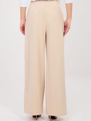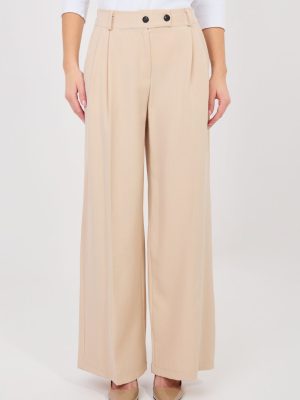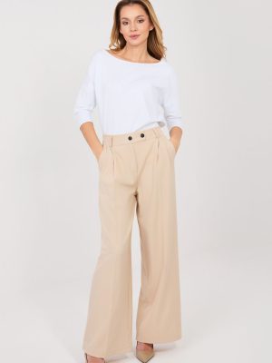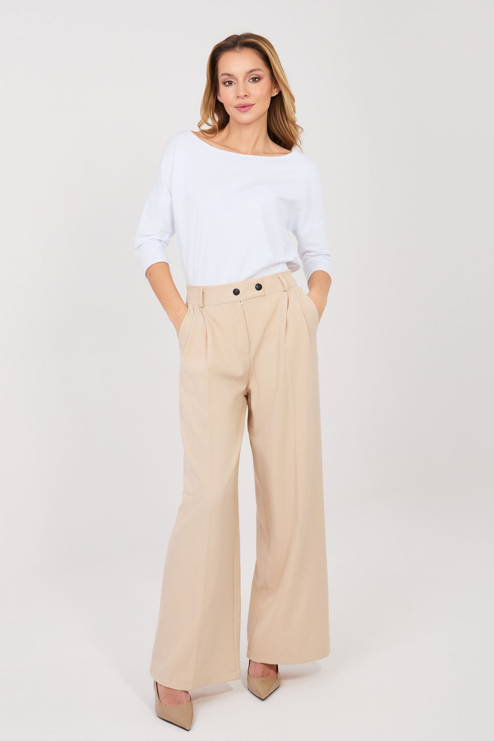 Οι κομψές γυναικείες παντελόνες τύπου wide leg είναι εξαιρετική επιλογή για καθημερινή χρήση, στη δουλειά ή σε πιο επίσημες περιστάσεις. Κατασκευασμένες από υψηλής ποιότητας πολυεστέρα με προσθήκη ελαστάνης, προσφέρουν άνεση κατά την εφαρμογή, ανθεκτικότητα και μια απαλή ελαστικότητα που επιτρέπει ελευθερία κινήσεων. Το ομαλό ύφασμα τους δίνει κλασικό και διαχρονικό χαρακτήρα. Το μοντέλο με ψηλή μέση αναδεικνύει υπέροχα τη μέση και οπτικά επιμηκύνει τη σιλουέτα, ενώ οι μακριές, φαρδιές πλευρές προσθέτουν ελαφρότητα και κομψότητα στην εμφάνιση. Τα παντελόνια κλείνουν με φερμουάρ και κουμπιά, διασφαλίζοντας καλή εφαρμογή. Οι πρακτικές πλαϊνές τσέπες αυξάνουν τη λειτουργικότητα και την άνεση κατά τη χρήση. Συνδυάζονται ιδανικά είτε με πουκάμισο και σακάκι, είτε με πιο casual μπλούζα.