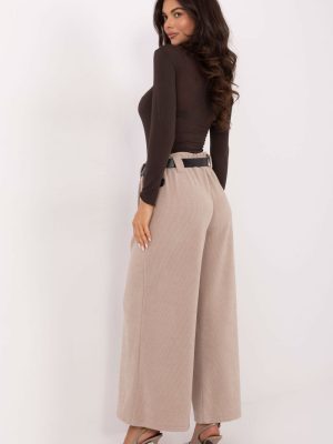 Στυλάτα υφασμάτινα παντελόνια με κομψό χαρακτήρα, ιδανικά για καθημερινή χρήση και για τη δουλειά. Κατασκευασμένα από μαλακό σουέτ με ποικιλόμορφη υφή, προσφέρουν εξαιρετική άνεση κατά την εφαρμογή και κομψή εμφάνιση. Το μοντέλο έχει ψηλή μέση και φαρδιά παντελόνια, που αγκαλιάζουν υπέροχα τη σιλουέτα, οπτικά την αδυνατίζουν. Στη μέση υπάρχει ραμμένη ελαστική ζώνη, που εγγυάται άνετη εφαρμογή, ενώ η ρυθμιζόμενη ζώνη επιτρέπει επιπλέον προσαρμογή στο περίγραμμα. Τα παντελόνια δεν διαθέτουν κούμπωμα, γεγονός που αυξάνει την άνεση χρήσης. Οι πλαϊνές, τσέπες προσθέτουν λειτουργικότητα και κομψότητα. Είναι εξαιρετική επιλογή για γυναίκες που εκτιμούν το συνδυασμό κομψότητας, άνεσης και μοντέρνου στυλ.