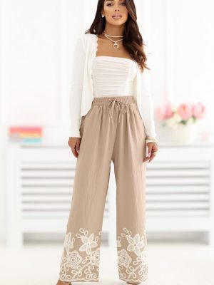 Τα γυναικεία παντελόνια τύπου wide leg είναι η ιδανική πρόταση για καθημερινές στυλιστικές επιλογές, συνδυάζοντας άνεση με κομψή, γυναικεία εμφάνιση. Η χαλαρή γραμμή με φαρδιές, μακριές παντελόνες εξασφαλίζει ελευθερία κινήσεων και αγκαλιάζει όμορφα τη σιλουέτα, δημιουργώντας ένα εντυπωσιακό, στιλάτο look. Το μοντέλο ξεχωρίζει λόγω της διακοσμητικής κεντητής λεπτομέρειας στα παντελόνια, η οποία προσθέτει πρωτοτυπία και διακριτική κομψότητα. Η ψηλή μέση αναδεικνύει όμορφα τη μέση, ενώ η ζώνη στη μέση επιτρέπει την ιδανική εφαρμογή και αυξάνει την άνεση κατά τη διάρκεια της χρήσης. Τα παντελόνια είναι φτιαγμένα από αεριζόμενο, ευχάριστο στην αφή βισκόζ, χάρη στο οποίο είναι ιδανικά για καθημερινή χρήση, ειδικά τις πιο ζεστές μέρες. Οι πρακτικές, πλευρικές τσέπες προσφέρουν λειτουργικότητα χωρίς να διαταράσσουν τον ελαφρύ χαρακτήρα του μοντέλου. Είναι εξαιρετική επιλογή για γυναίκες που εκτιμούν την άνεση, το στυλ και τις μοναδικές λεπτομέρειες στην ντουλάπα τους.