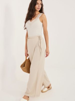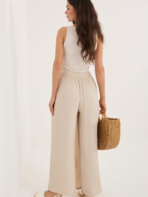 Οι γυναικείες παντελόνες τύπου wide leg είναι μια στιλάτη και άνετη πρόταση για καθημερινή χρήση καθώς και για εργασία σε λιγότερο επίσημο περιβάλλον. Η χαλαρή γραμμή τους με φαρδιές, μακριές παντελόνες προσδίδει στο σιλουέτα ελαφρότητα και σύγχρονο χαρακτήρα, διασφαλίζοντας ταυτόχρονα πλήρη ελευθερία κινήσεων. Το μοντέλο έχει υψηλή μέση με ραμμένο λάστιχο στη μέση, το οποίο εξασφαλίζει άνεση στην χρήση και καλή εφαρμογή στη σιλουέτα. Η απλή ύφανση υπογραμμίζει την ευχρηστία των παντελονιών, επιτρέποντας έτσι να συνδυαστούν εύκολα με διάφορα στοιχεία της γκαρνταρόμπας. Κατασκευασμένα από ευχάριστο στην αφή μείγμα βισκόζης και ελαστάνης, τα παντελόνια είναι μαλακά, ελαστικά και κατάλληλα για το σώμα. Ένα μοναδικό στοιχείο είναι η υφασμάτινη λωρίδα που μιμείται το μπροστινό μέρος της φούστας, η οποία στερεώνεται με κόμπο στη μέση και προσθέτει μια πρωτότυπη, μοντέρνα αίσθηση στο σύνολο. Το μοντέλο χωρίς τσέπες διατηρεί μια μινιμαλιστική μορφή, ιδανική για κομψές και καθημερινές στυλιστικές προτάσεις. Είναι μια εξαιρετική επιλογή για γυναίκες που εκτιμούν την άνεση και τον σύγχρονο σχεδιασμό. Σημειώσεις: Το μέγεθος στην ετικέτα είναι M/L, ωστόσο το μοντέλο φαίνεται μικρότερο, αντιστοιχώντας στο μέγεθος S/M (μειωμένο).
