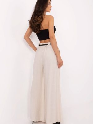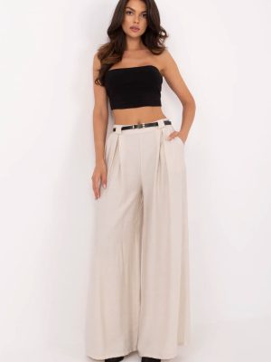Στυλάτοι καθιστοί γυναικείοι παντελόνες palazzo είναι η ιδανική επιλογή για καθημερινή χρήση και για το γραφείο. Ραμμένα από ένα ελαφρύ και ευχάριστο στην αφή μείγμα βισκόζης και ναυλον, προσφέρουν άνεση κατά τη διάρκεια της χρήσης και μια χαλαρή, κομψή εμφάνιση. Το μοντέλο με λεία υφή και φαρδιά μπατζάκια προβάλλεται εξαιρετικά ελαφρύ και σύγχρονο. Η ψηλόμεση μέση με ελαστική ζώνη ραμμένη στο πίσω μέρος προσαρμόζεται τέλεια στη σιλουέτα, τονίζοντας τη μέση και προσφέροντας άνεση καθ’ όλη τη διάρκεια της ημέρας. Τα παντελόνια δεν διαθέτουν κλασικό κλείσιμο, κάτι που αυξάνει περαιτέρω την άνεση. Στο σετ περιλαμβάνεται ζώνη με κλείσιμο που τονίζει τη μέση και προσθέτει μια κομψή φινέτσα στο σύνολο. Οι πλαινές, ενσωματωμένες τσέπες αυξάνουν την πρακτικότητα τους.
